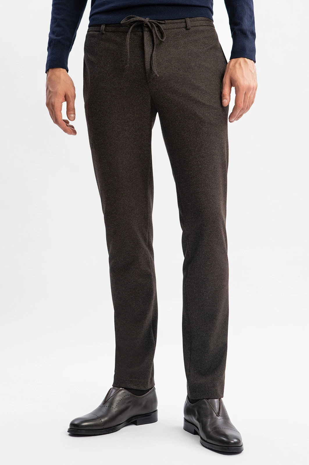 Серо-коричневые брюки KANZLER с кулиской из мягкой смесовой шерстяной ткани в мелкий рубчик — удобная повседневная модель, основа для создания образов в офисном и городском стилях. Приталенный силуэт вытягивает и стройнит фигуру. Шнурок-затяжка позволяет регулировать степень прилегания брюк. Приятная воздухопроницаемая ткань из шерсти поддерживает оптимальную для тела температуру. Для практичности, износоустойчивости и сохранения формы материал усилен волокнами вискозы, полиэстера и эластана. Подкладка из прочной гладкой ткани облегчает надевание. Параметры модели: рост 192, 101-76-97 Размер на модели: 50