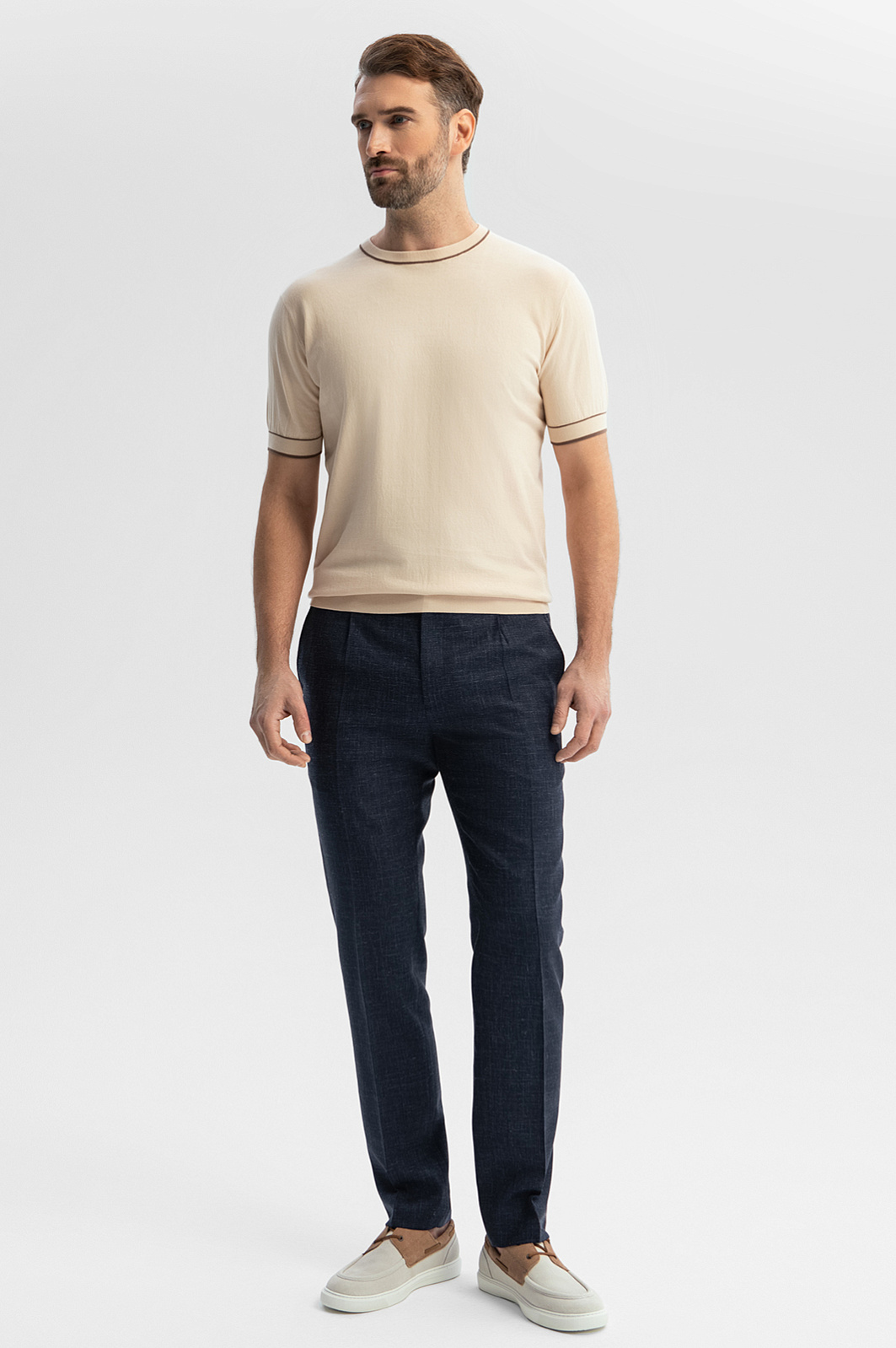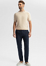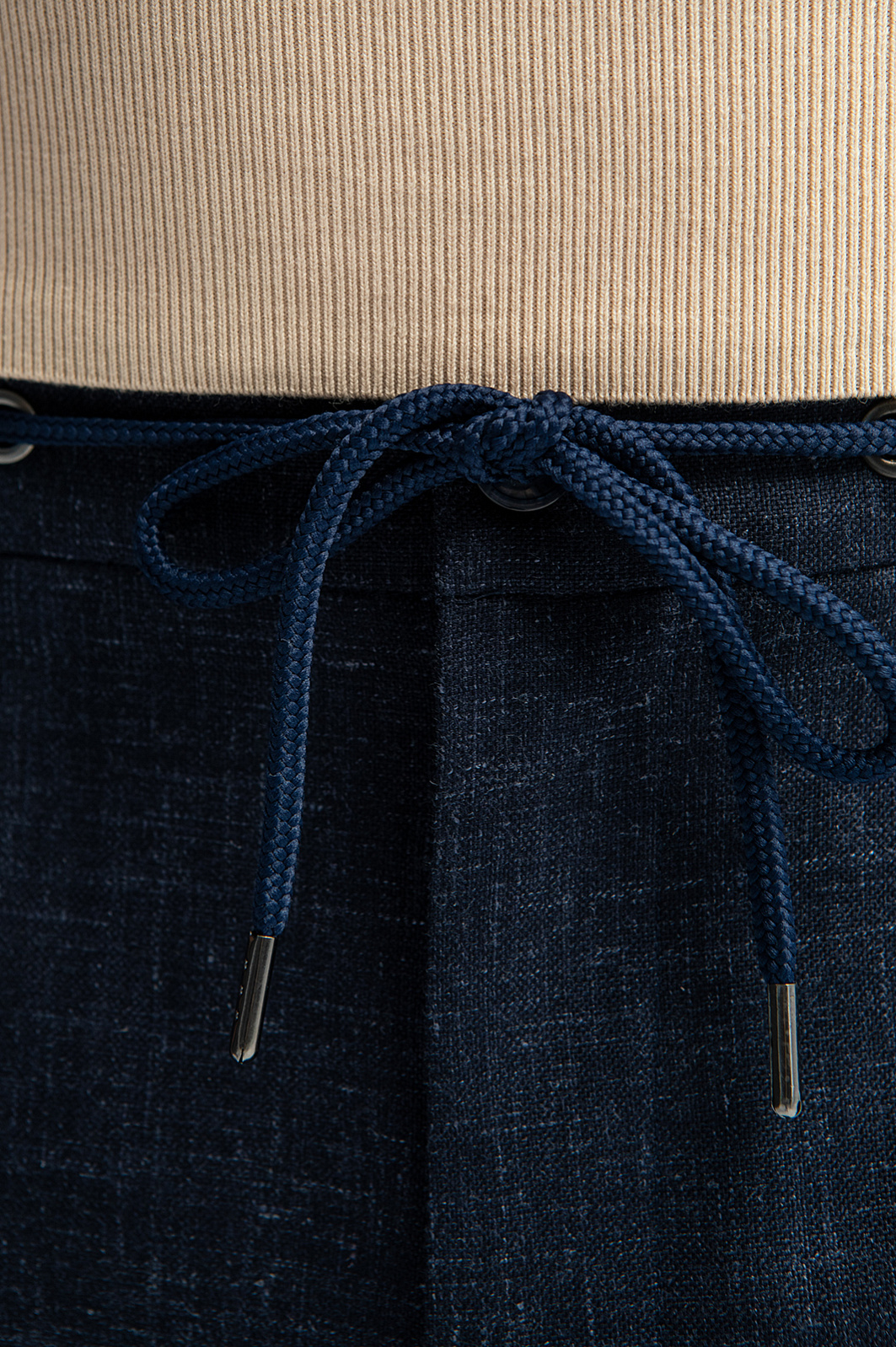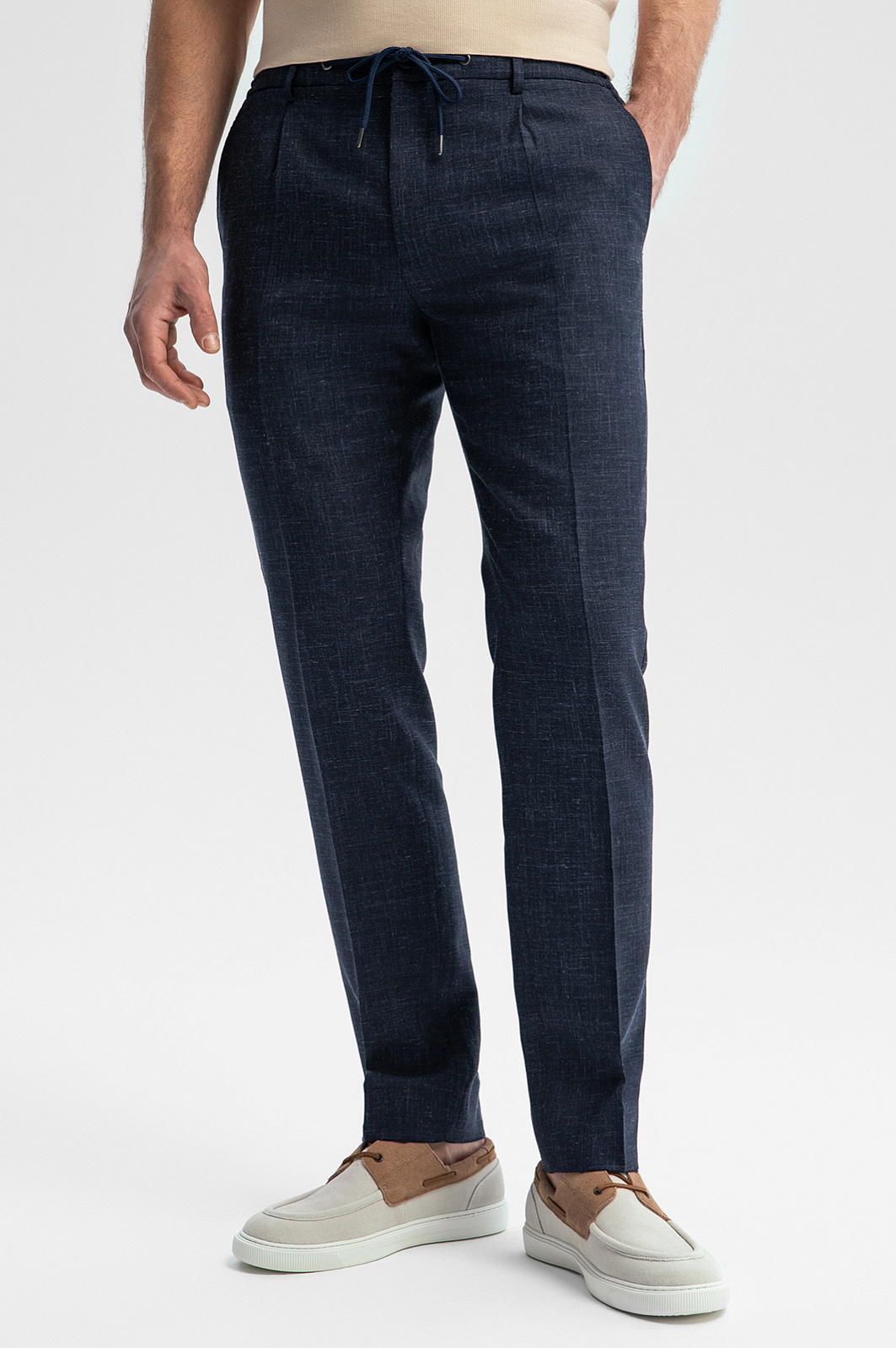 Темно-синие брюки KANZLER на кулиске из дорогой костюмной ткани с красивым переплетением подойдут для случаев, требующих элегантности. Приталенный крой и стрелки вытягивают силуэт, добавляя фигуре легкости. Объем талии и плотность посадки легко регулируется шнурком на линии пояса. Дорогой костюмный материал из тонкой шерсти, льна и шелка выглядит безупречно. Сертифицированная овечья шерсть Супер 120S (82%) не мнется и сохраняет естественное тепло, лен (15%) отлично пропускает воздух и поддерживает теплообмен, шелк (3%) придает ткани благородный лоск. Параметры модели: рост 189, 102-80-99 Размер на модели: 50