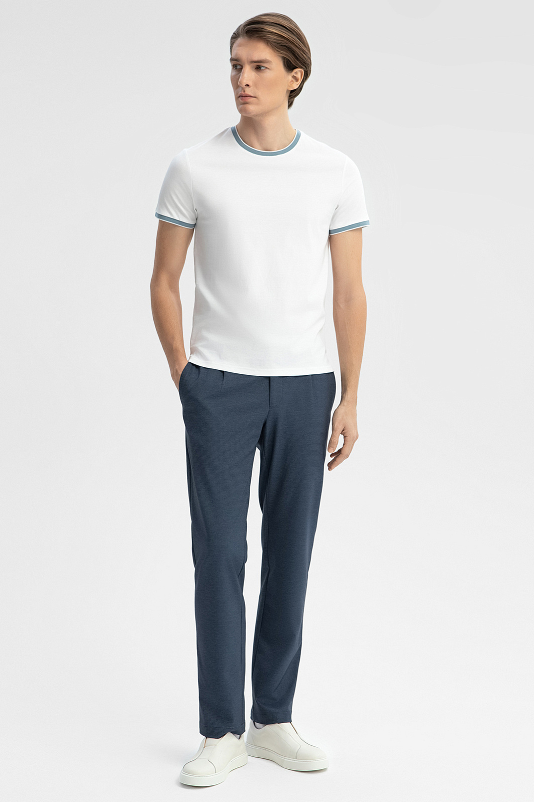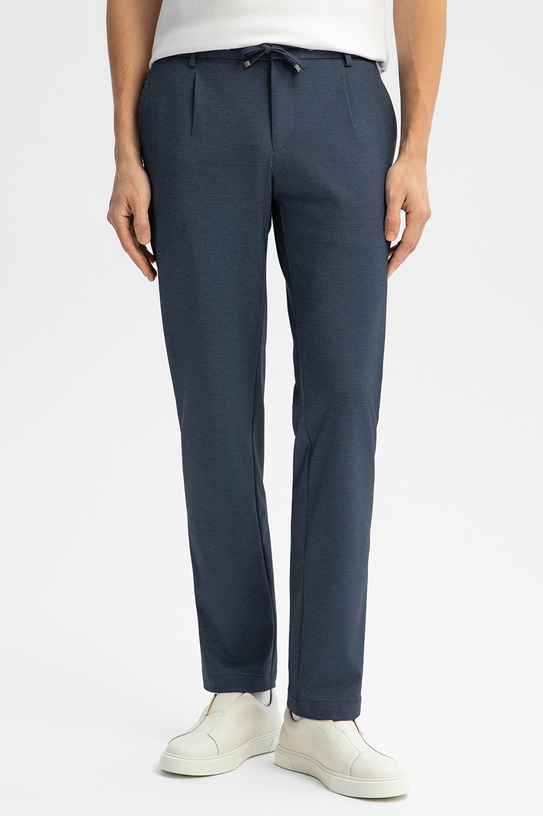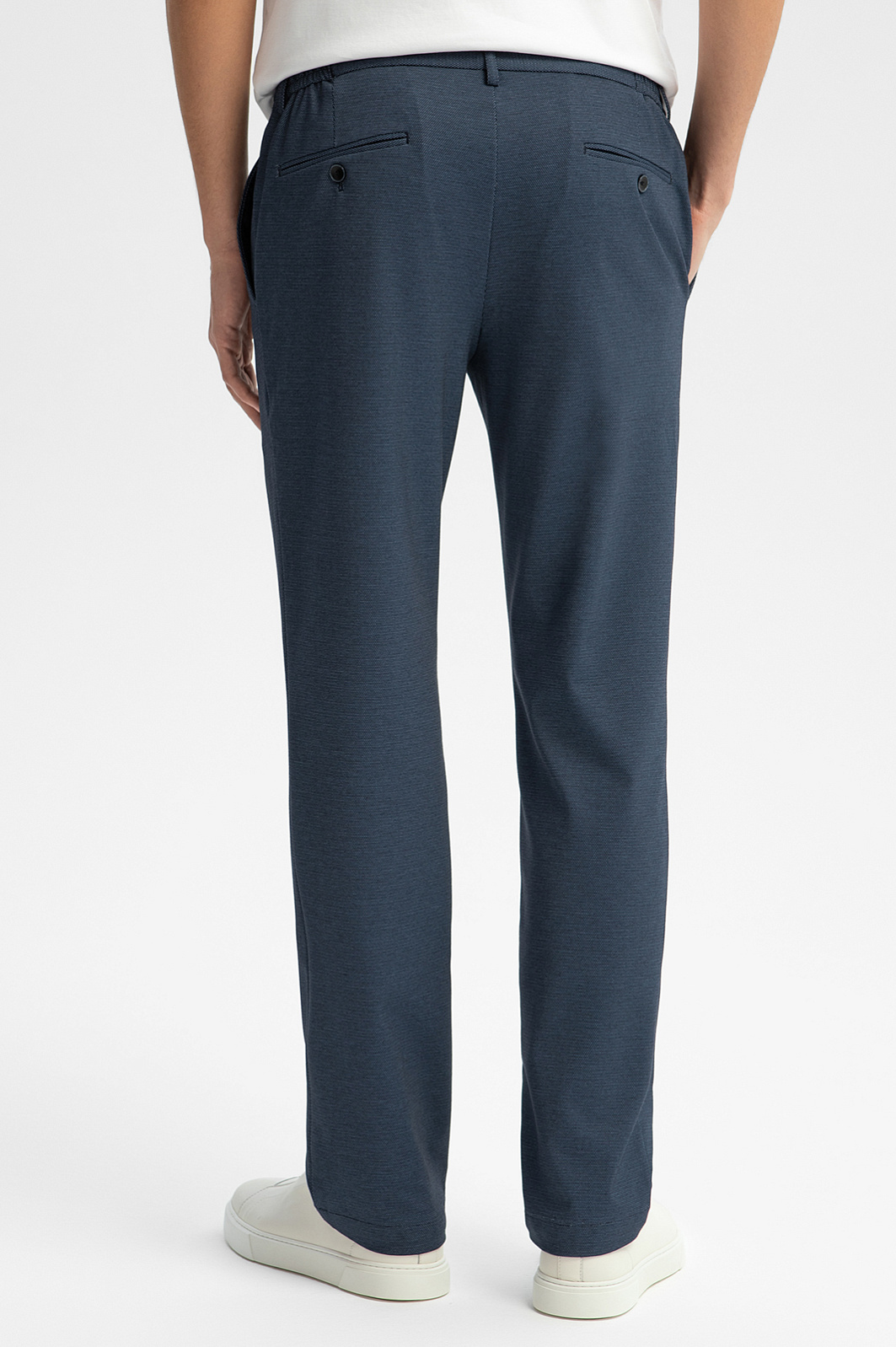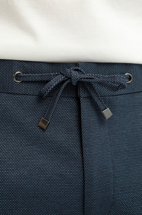 Удобные офисные брюки KANZLER из практичной ткани синего цвета с точечным рисунком сочетают классический слегка зауженный крой и современные детали, позаимствованные у спортивной одежды. Легкие защипы спереди обеспечивают хорошую посадку. Регулируемый шнурок и эластичный пояс делают ремень ненужным и позволяют собираться на работу в считанные минуты. Современная смесовая ткань сочетает достоинства прочного и долговечного полиэстера, легкой и приятной на ощупь вискозы и спандекса, который поддерживает аккуратный вид брюк и не дает материалу растягиваться. В случаях, требующих элегантности, можно дополнить брюки легким пиджаком KANZLER, сшитым из такой же ткани.