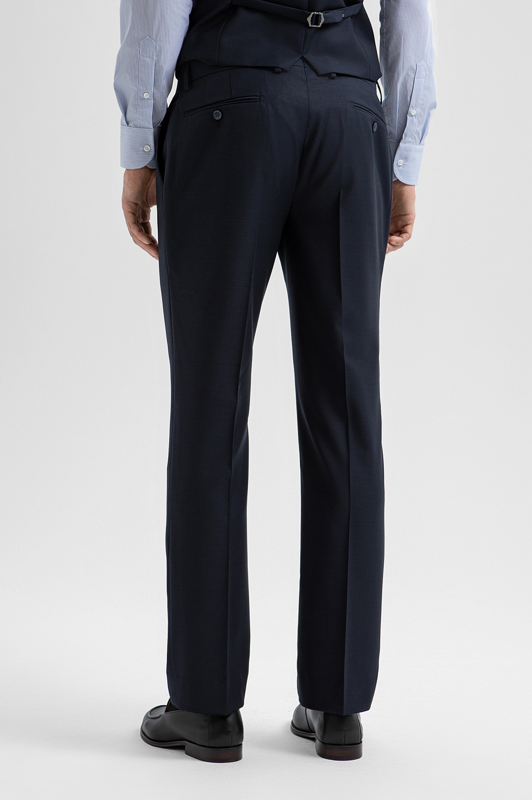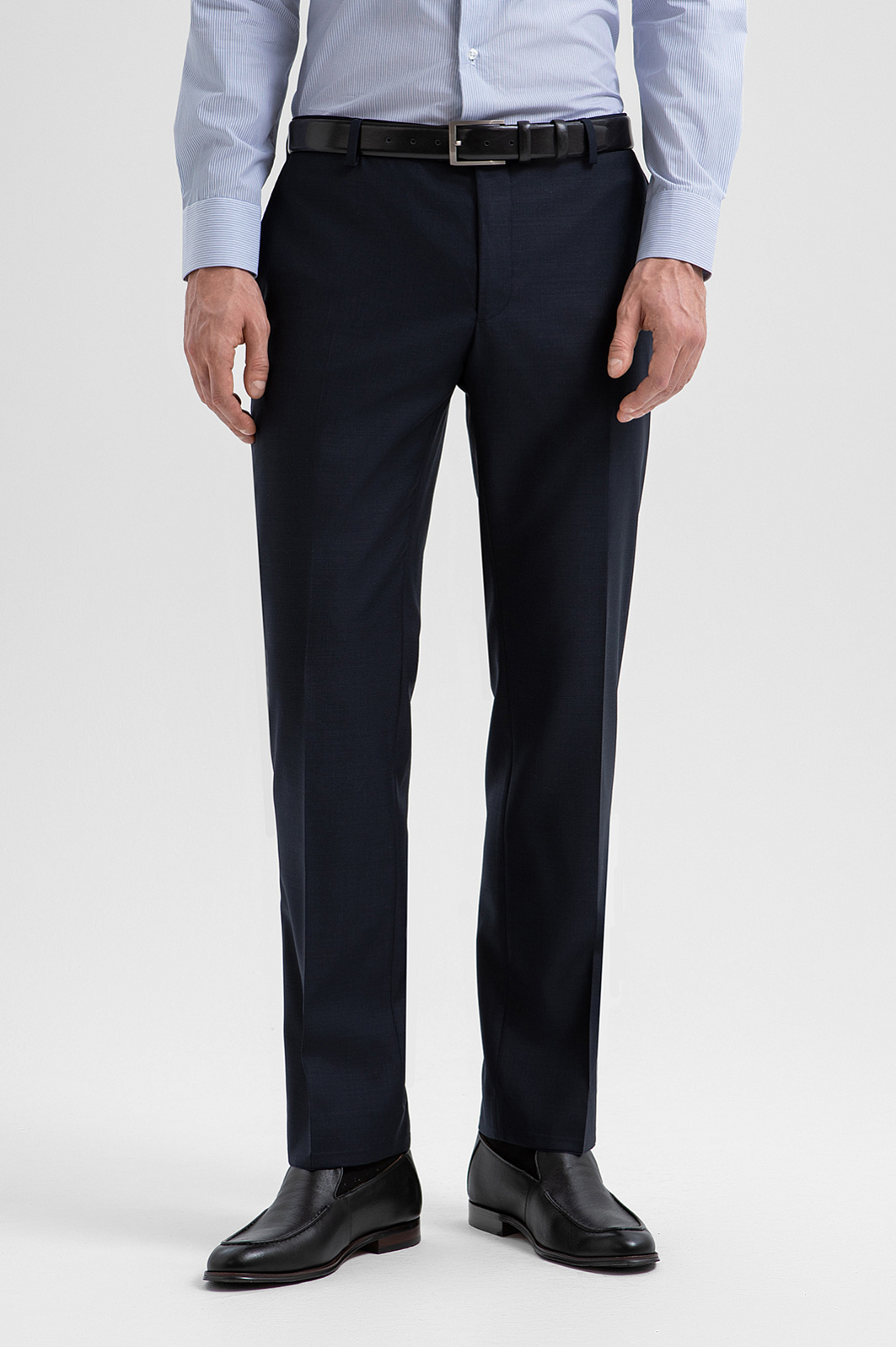 Брюки KANZLER из тонкой мериносовой шерсти Супер 120S глубокого синего цвета — основа безупречного делового образа. Если дополнить их пиджаком KANZLER из той же ткани, получится дорогой элегантный костюм, в котором можно отправиться на переговоры, официальное или светское мероприятие. Для создания повседневных образов брюки можно носить с сорочкой или джемпером. Крой обеспечивает точную посадку. Стрелки вытягивают силуэт и придают уверенность каждому шагу. Дорогая костюмная ткань создана из шерсти мериноса (100%). Ворс мериноса в два раза тоньше других видов шерсти. Это нежный гипоаллергенный материал, который не раздражает даже самую чувствительную кожу. Гладкая прочная подкладка защищает основную ткань от износа и обеспечивает лёгкое скольжение при надевании.