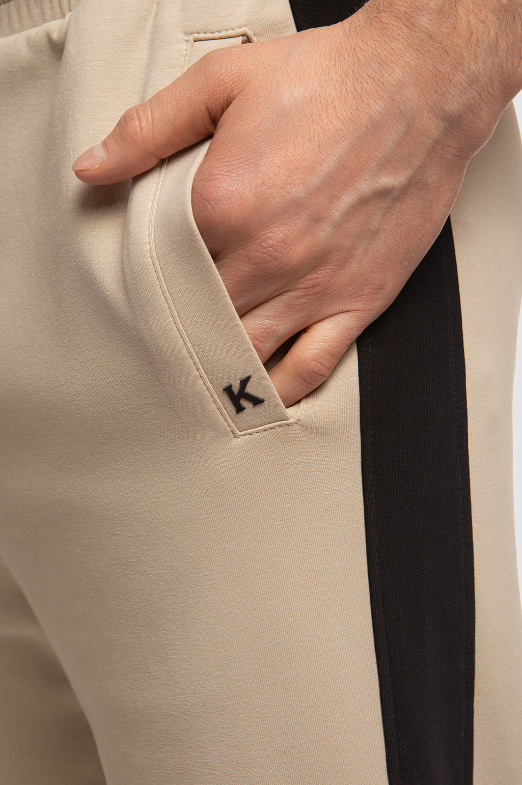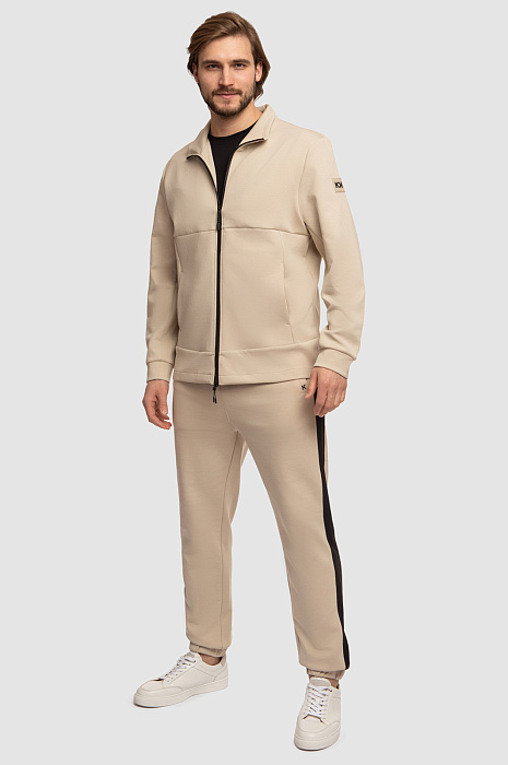Трикотажные брюки KANZLER — стильная, универсальная, удобная и по-настоящему необходимая вещь в модном мужском гардеробе текущего сезона. Для пошива бежевых брюк использовали мягкий трикотаж из органического хлопка и прочных синтетических волокон. Материал хорошо пропускает воздух, быстро отводит влагу, сохраняет первоначальный вид даже после многочисленных стирок. Модель обеспечивает безупречный внешний вид и комфорт во время прогулок и активного отдыха. Брюки на кулиске декорированы контрастными лампасами черного цвета и небольшой буквой K на кармане. Джоггеры комфортно садятся по фигуре и подходят для повседневных образов или занятий спортом. Дополнить образ можно толстовкой на молнии, однотонной белой футболкой и кедами.