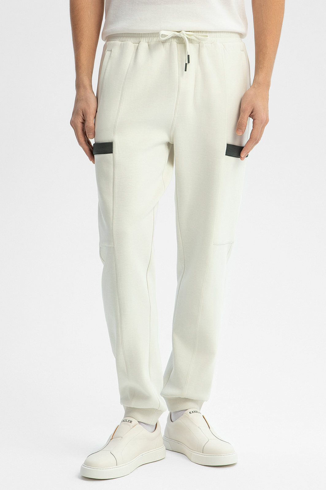 Светло-бежевые брюки KANZLER на кулиске из плотного хлопкового трикотажа — удобная спортивная модель для отдыха в теплые дни. Вертикальные швы придают модели структурность. Шнурок на поясе позволяет регулировать объем талии. Акцентные детали — контрастные темно-серые вставки, расположенные по краю карманов на бедрах. Модель выполнена из мягкого дышащего гипоаллергенного хлопка (80%), упрочненного полиэстером. Небольшая добавка спандекса служит для поддержания формы и адаптации к индивидуальным особенностям фигуры. Параметры модели: рост 191, 97-77-99 Размер на модели: M