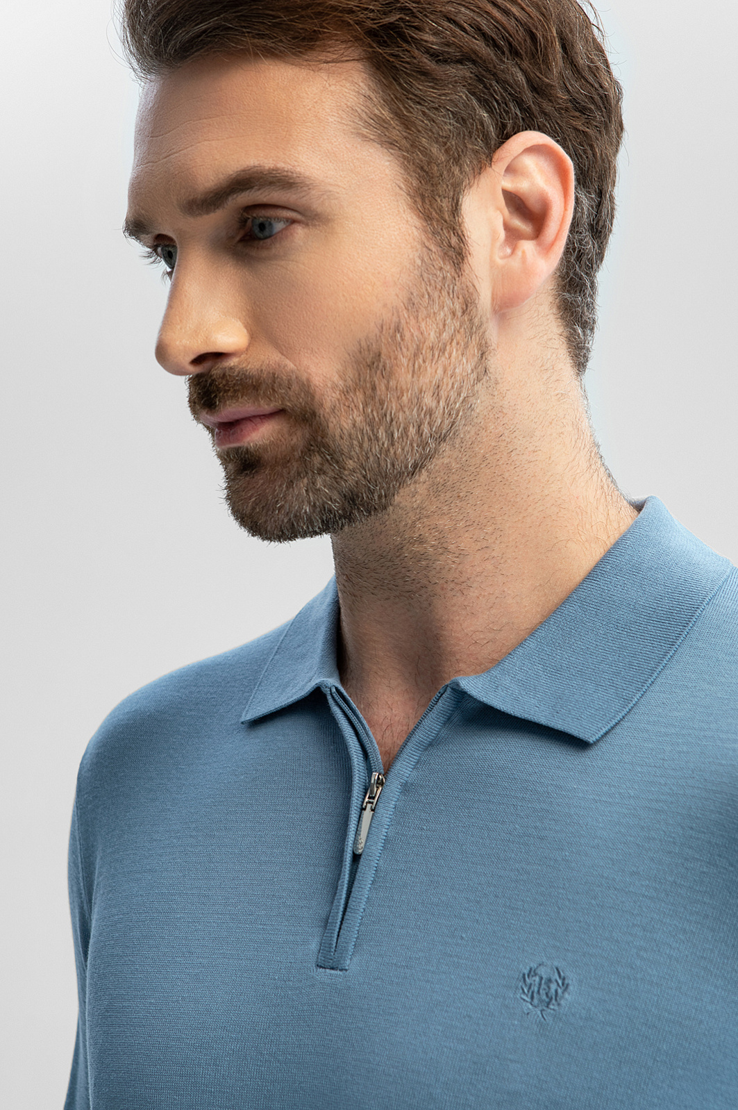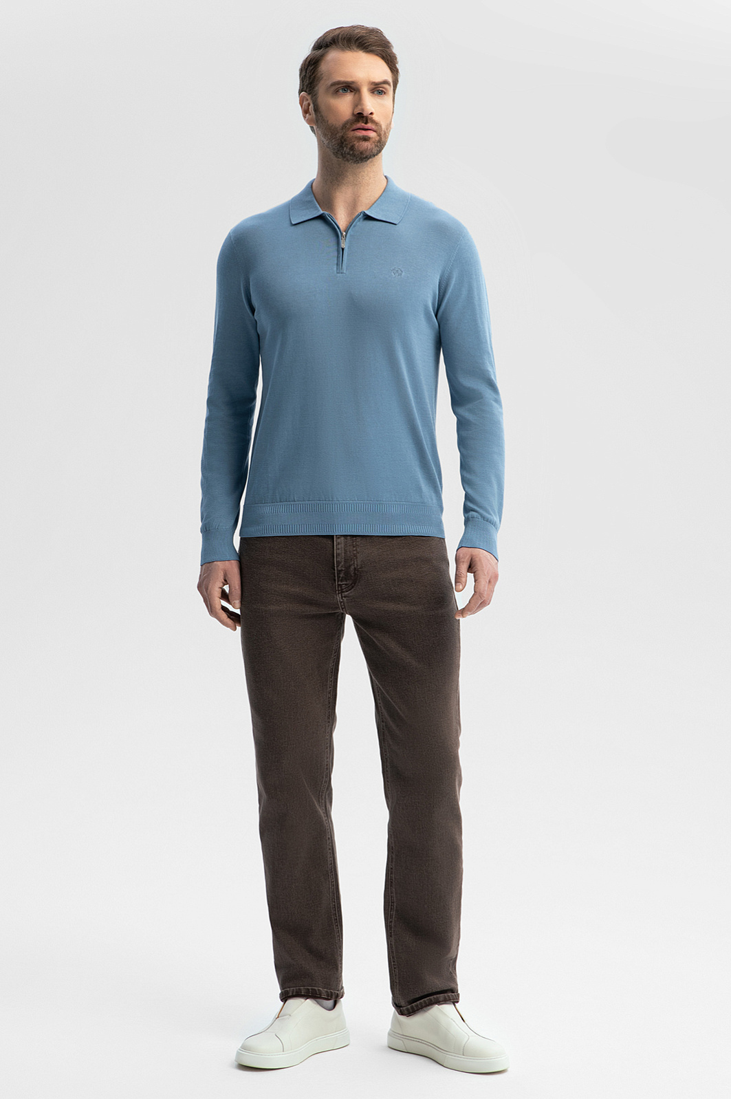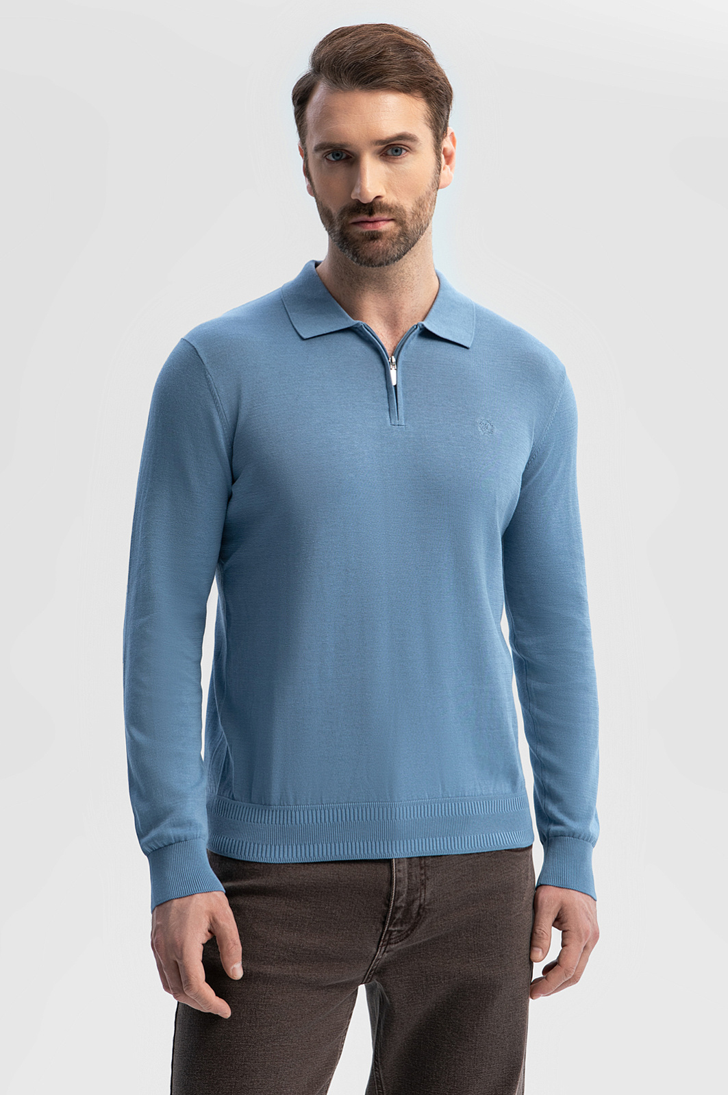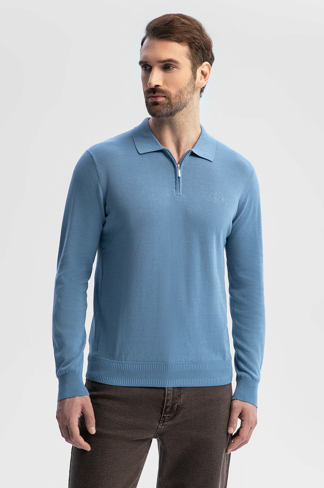 Голубое поло KANZLER с длинным рукавом — модель, в которой каждая деталь создана для вашего комфорта. Премиальный смесовый материал объединил лучшие качества трех видов натуральных волокон: мягкость и легкость хлопка, нежность шелка и прочность льна. Гладкая матовая фактура обеспечивает деликатное соприкосновение с кожей. Спокойный голубой оттенок освежает и становится акцентом образа. Воротник на молнии придает модели одновременно спортивный и утонченный вид. Для аккуратной посадки по фигуре предусмотрена мягкая эластичная резинка на манжетах и вдоль низа изделия. На груди — вышитый логотип бренда. Поло идеально подходит для прогулок в прохладные летние вечера, особенных мероприятий или деловых будней, гармонично сочетаясь как с повседневными джинсами, так и с элегантными брюками. Параметры модели: рост 189, 102-80-99 Размер на модели: M