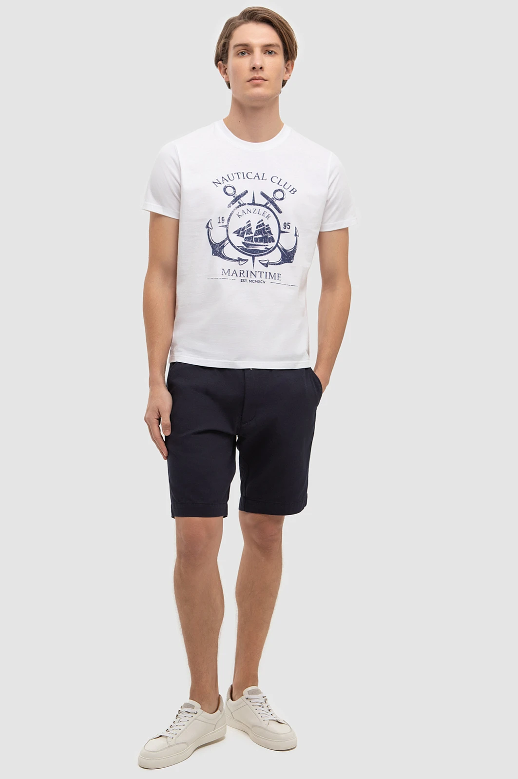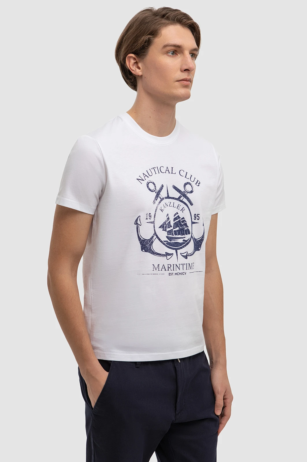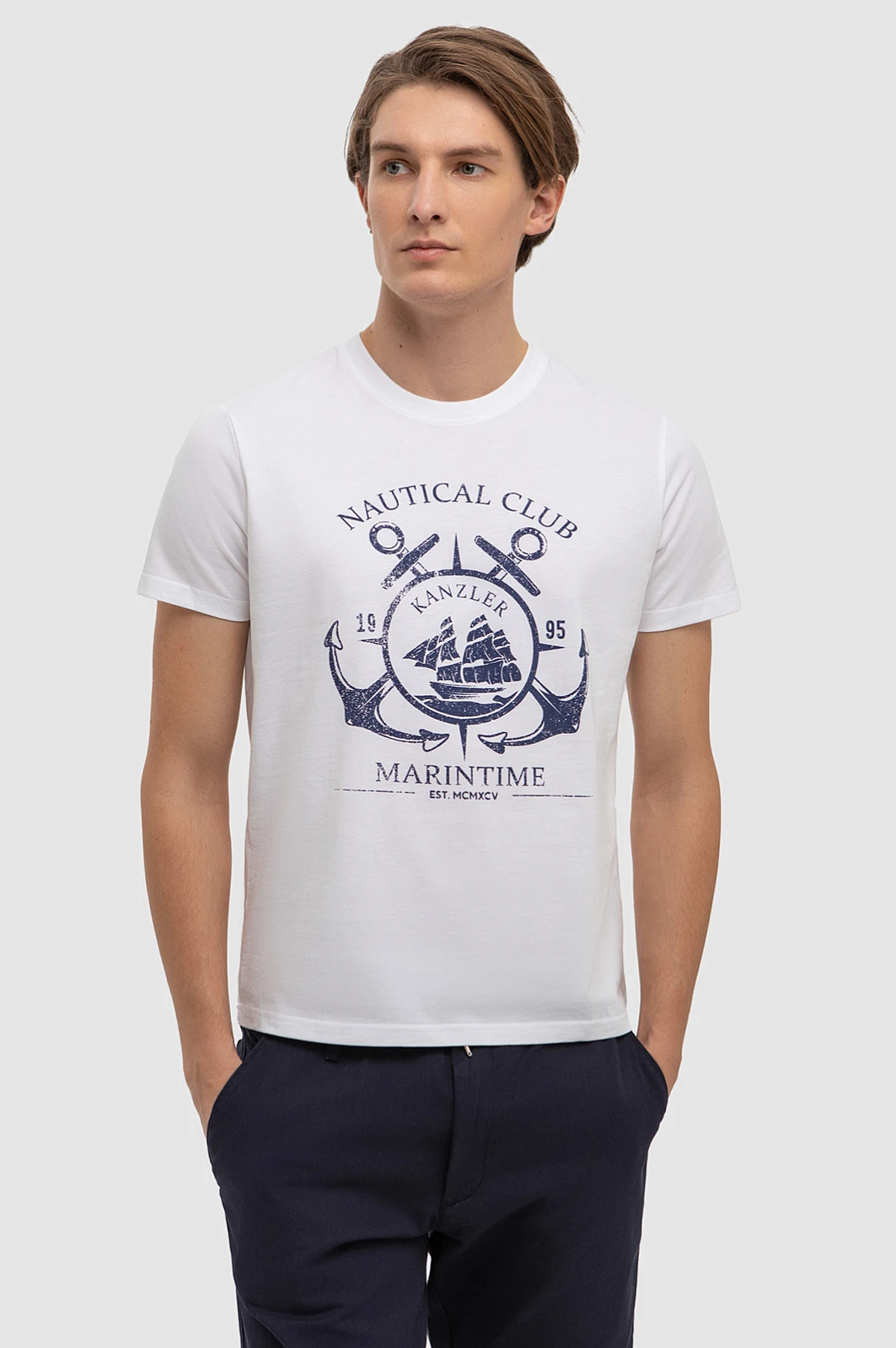 Белоснежная футболка KANZLER из хлопка с принтом в морском стиле создана, чтобы подчеркнуть утонченность вашего образа и добавить в гардероб нотку морской романтики. Модель выполнена из 100% натурального гипоаллергенного хлопка, обладающего отличной воздухопроницаемостью и мягкостью, необходимой для комфорта в жаркие дни. Футболка легко комбинируется с джинсами или шортами, создавая непринужденные образы для прогулок на яхте, летнего отпуска или посиделок с друзьями у моря. Стилисты рекомендуют сочетать модель с темно-синими шортами и белыми кедами. Параметры модели: рост 191, 97-77-99 Размер на модели: M