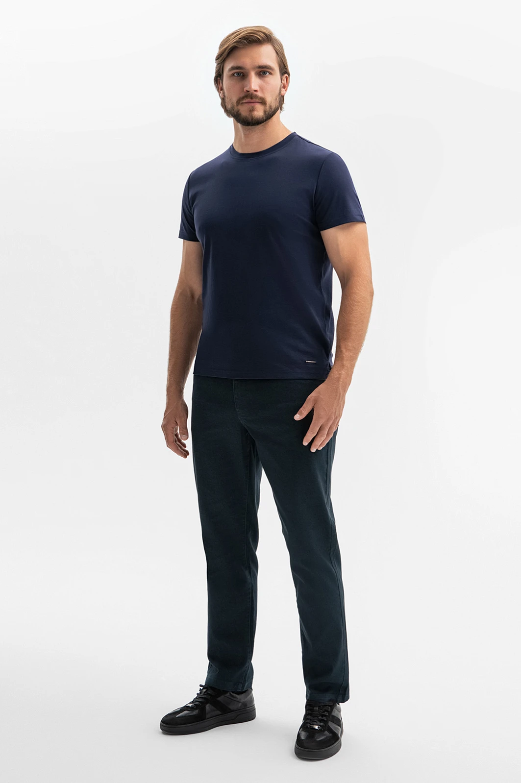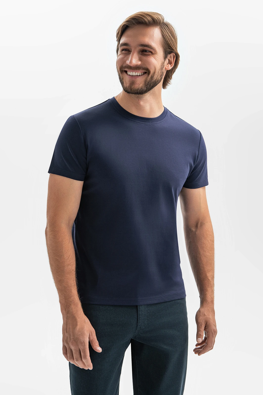 Полуприлегающая футболка в благородном синем оттенке  – комфортная базовая модель для функционального гардероба. 100% мерсеризованный хлопок отличается особой прочностью и способностью сохранять первоначальный вид даже после множества стирок. Мягкий дышащий материал обладает особой гладкостью и напоминает шелк, что выводит базовую модель на новый уровень и добавляет нотку шика. Безупречная посадка и Приталенный силуэт подчеркнут достоинства фигуры. Модель декорирована аккуратным металлическим шильдиком с логотипом бренда. Параметры модели: рост 187, 100-81-97 Размер на модели: M