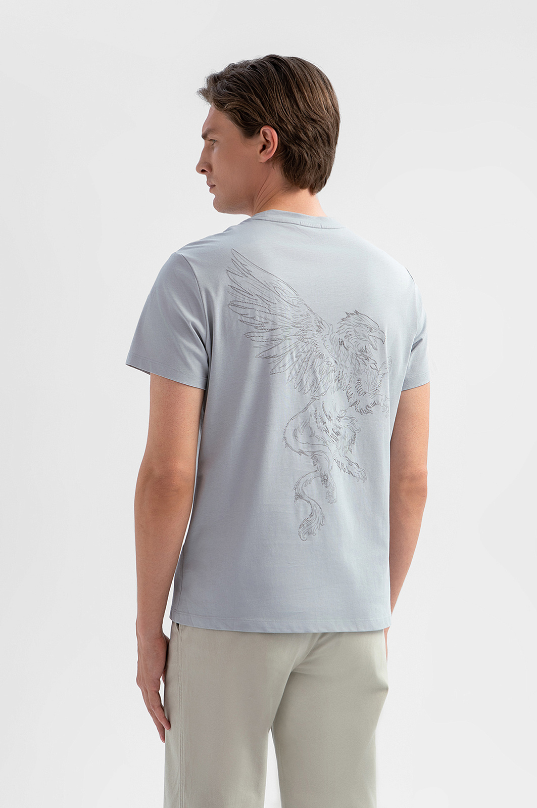 Футболка KANZLER – для тех, кто видит одежду как способ выразить внутреннюю силу. Серебристо-серый оттенок служит идеальным фоном для детализированного принта на спине, изображающего грифона – символ могущества и благородства. 100-процентный хлопок, мягкий и гипоаллергенный, обеспечивает идеальную воздухопроницаемость и отводит влагу, а сатиновая фактура дарит тактильный комфорт на протяжении всего дня. Крой точно следует линиям тела, подчеркивая мужественность фигуры и сохраняя свободу движения. Параметры модели: рост 191, 97-77-99 Размер на модели: M