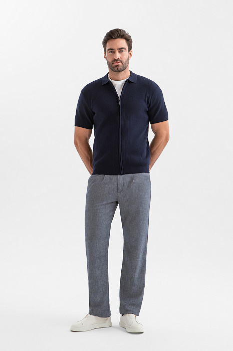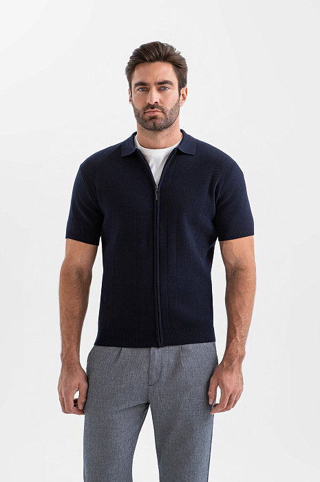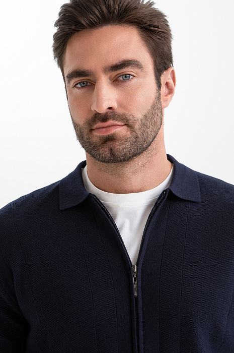 Роскошный тёмно-синий кардиган KANZLER из хлопка и шёлка с коротким рукавом на молнии — универсальная модель, которую можно надевать в качестве лёгкого верхнего слоя в прохладные дни и межсезонье. Застегнутый и расстегнутый кардиган создаёт два совершенно разных образа — сдержанный и расслабленный. Первый подойдет для офиса с нестрогим дресс-кодом, второй — для отдыха. Дорогой трикотаж выполнен из хлопка с добавлением шёлка. Такая комбинация натуральных гипоаллергенных волокон делает ткань дышащей, мягкой и нежной.