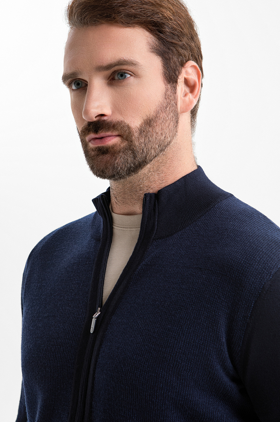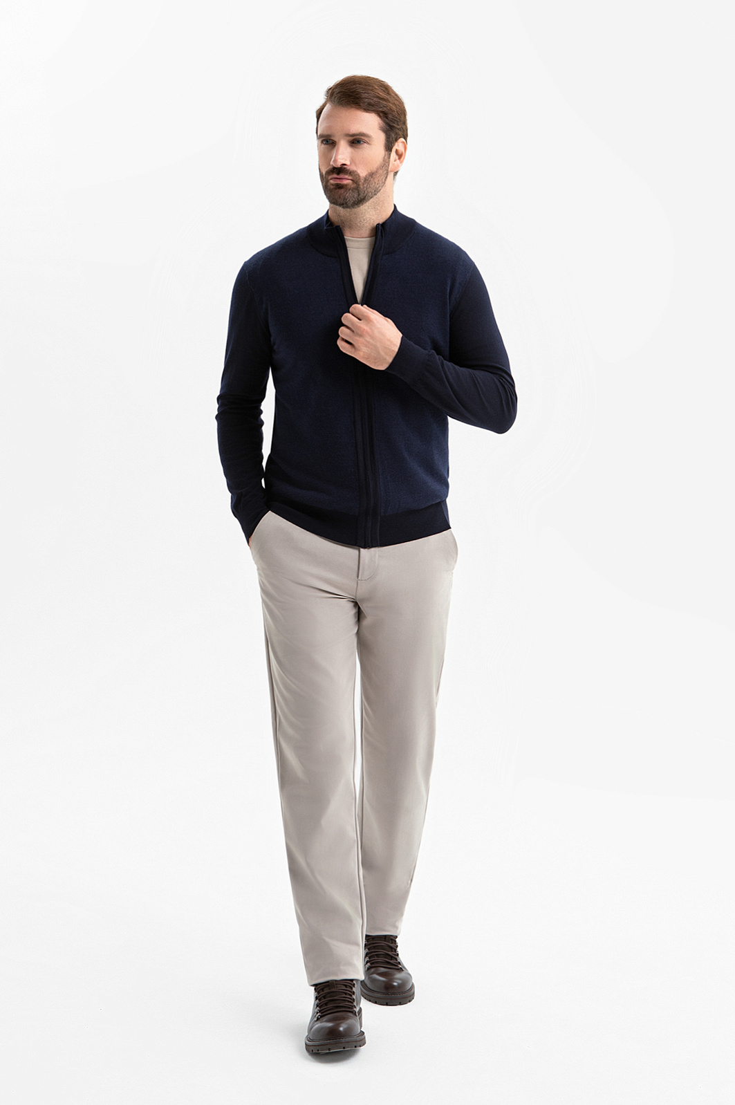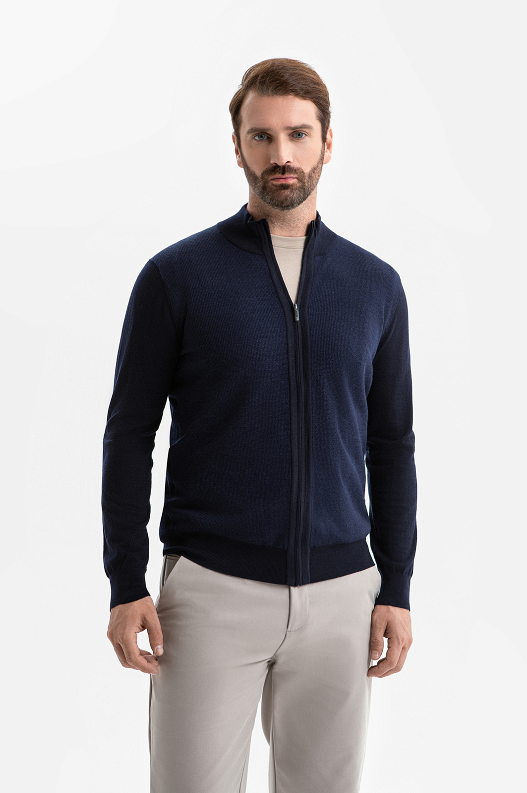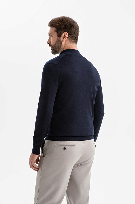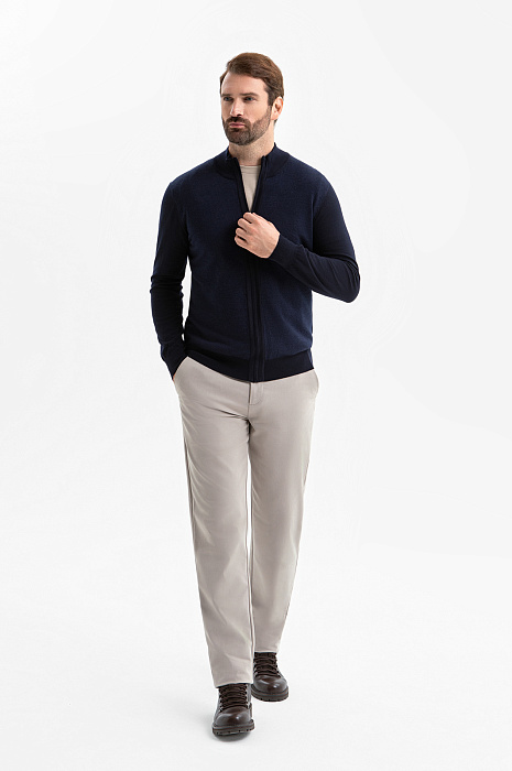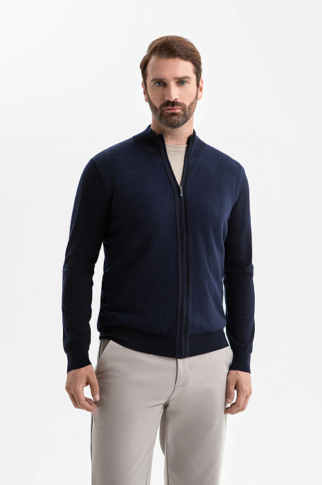 Кардиган KANZLER на молнии в синем оттенке воплощает сдержанную элегантность, комфорт и современный минимализм. Глубокий тёмно-синий оттенок легко вписывается как в деловой, так и в повседневный гардероб, создавая образ уверенного и стильного мужчины. Лаконичный дизайн подчёркнут трикотажными резинками, которые формируют аккуратный силуэт, добавляют удобства и сохраняют форму кардигана даже при активной носке. Функциональная молния дополнена небольшим язычком из белого металла, который служит деликатным акцентом. Кардиган выполнен из гладкого эластичного шерстяного трикотажа (100%), который обеспечивает мягкость и тепло и сохраняет безупречный внешний вид. Параметры модели: рост 189, 102-80-99 Размер на модели: M