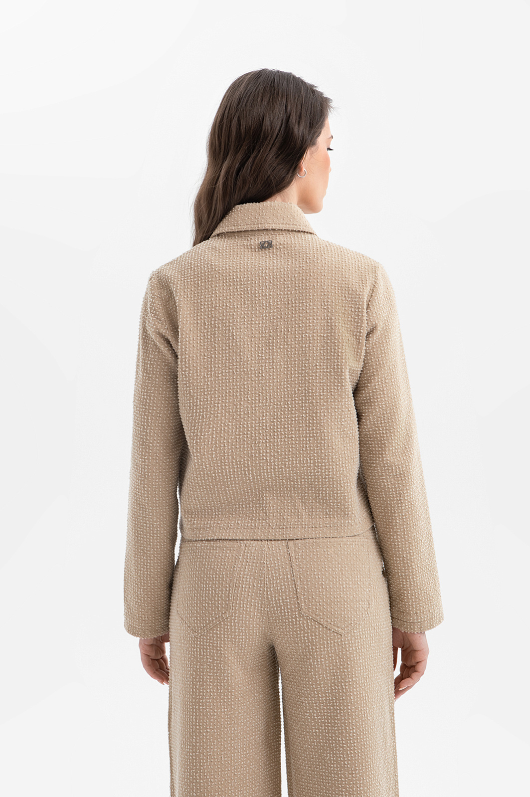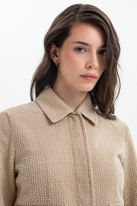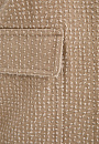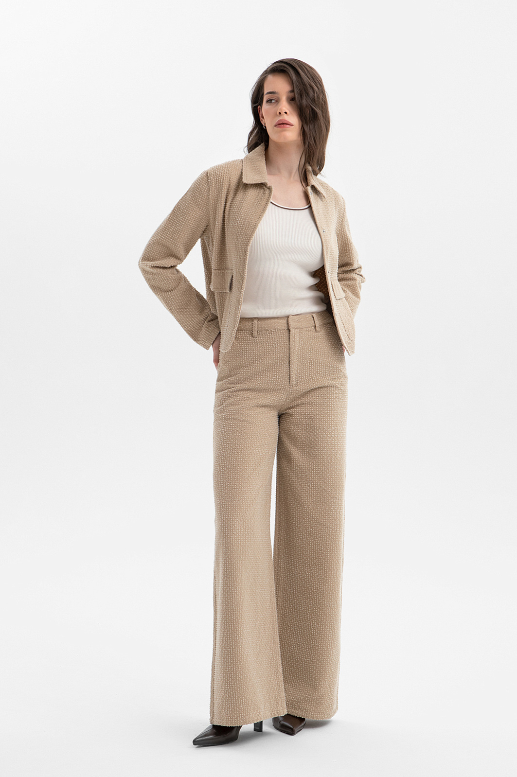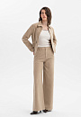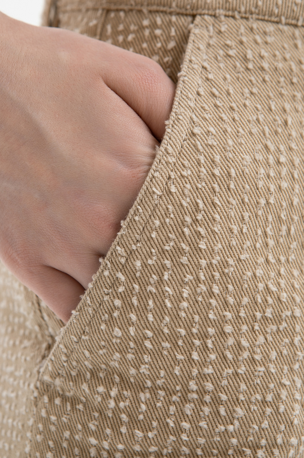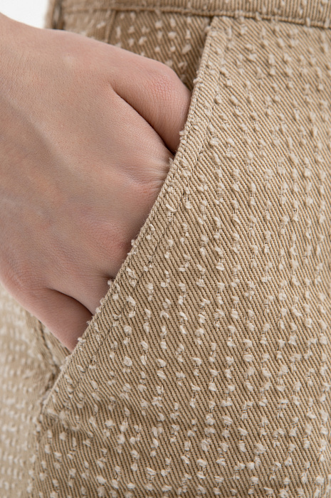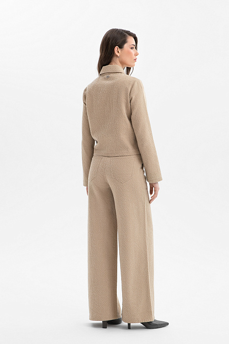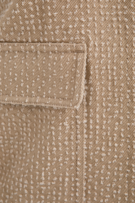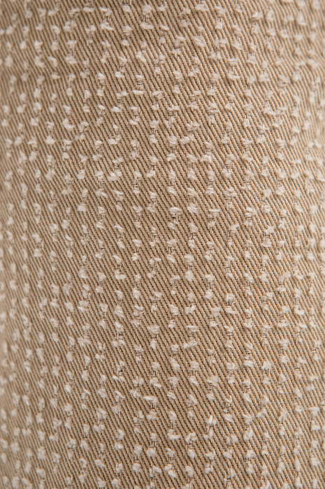 Бежевый брючный костюм KANZLER из чистого хлопка — готовое решение для работы в креативном офисе, выхода в город или встреч без лишних формальностей. Сет составлен из современного укороченного пиджака с застёжкой на кнопки и удобных расклешённых брюк актуального силуэта. Особое внимание привлекает ткань. Белый ворс создаёт выразительный текстурный узор, который добавляет модели шарм и приятную тактильность. В составе — воздухопроницаемый гипоаллергенный хлопок (100%). Саржевое плетение формирует плотную диагональную структуру полотна, благодаря которой материал хорошо держит форму и сохраняет аккуратный внешний вид.