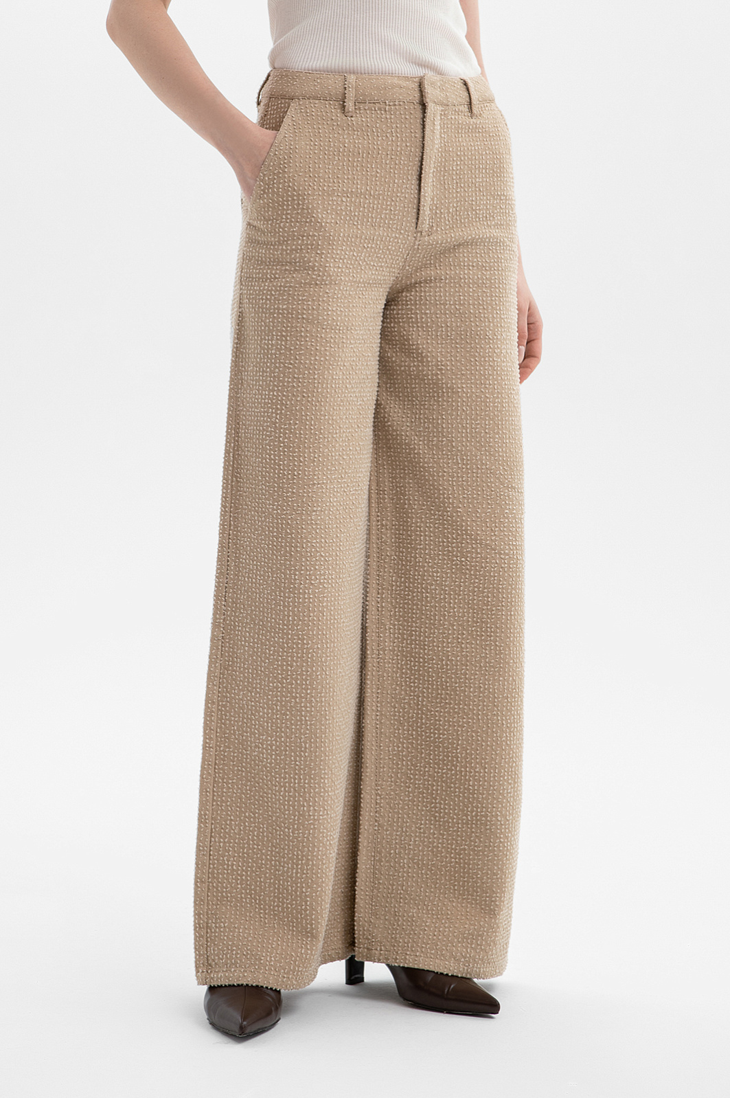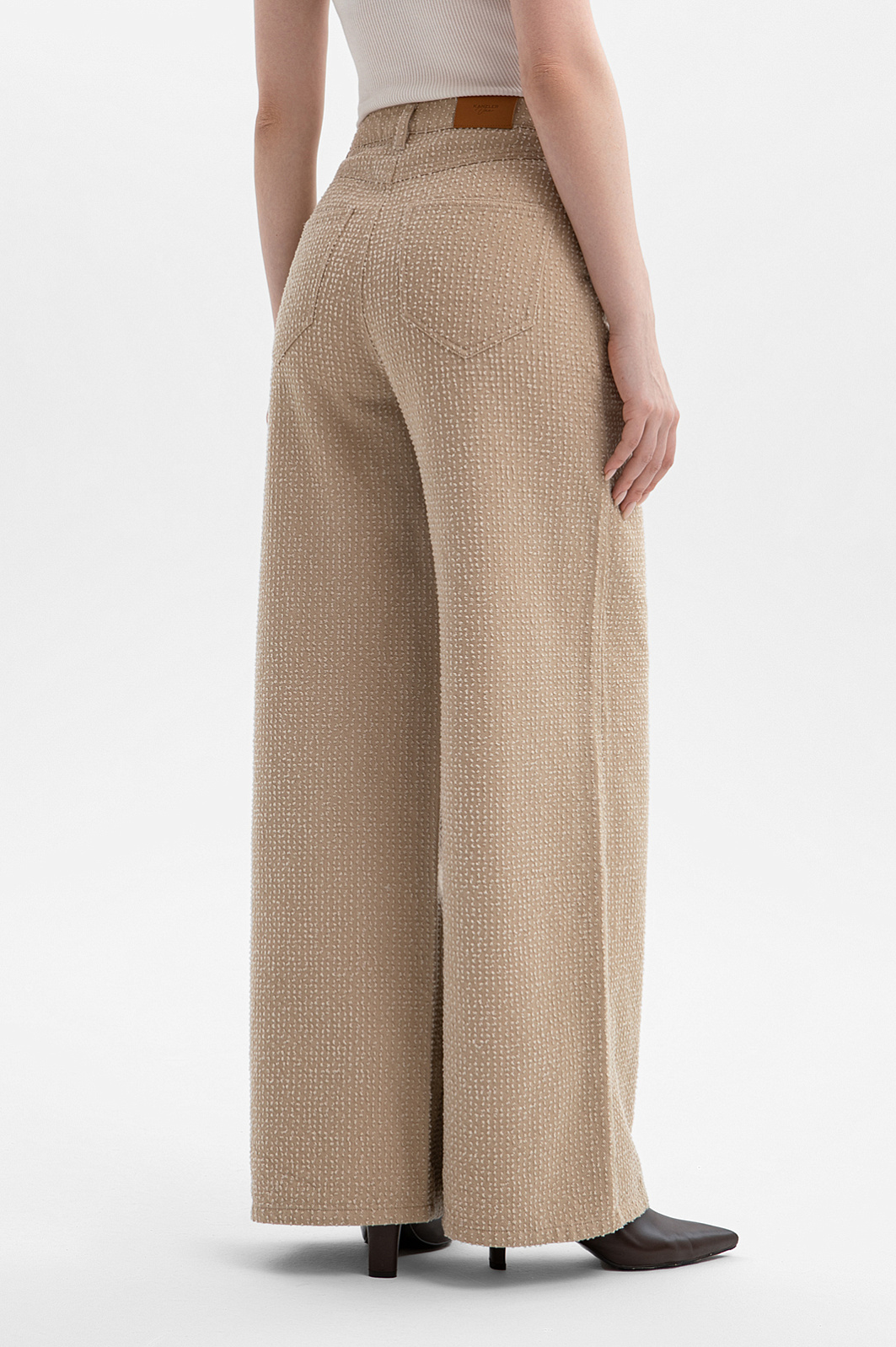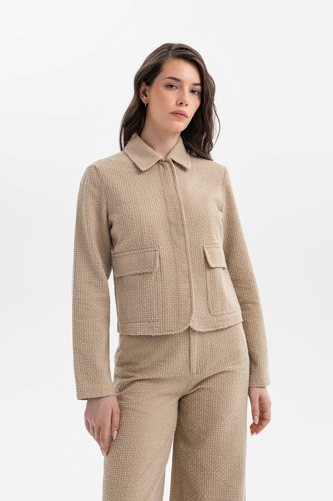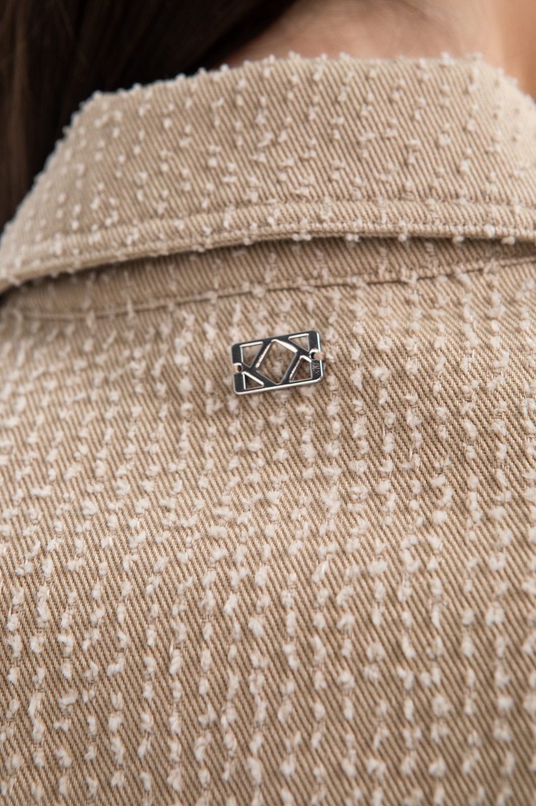 Бежевый брючный костюм KANZLER из чистого хлопка — готовое решение для работы в креативном офисе, выхода в город или встреч без лишних формальностей. Сет составлен из современного укороченного пиджака с застёжкой на кнопки и удобных расклешённых брюк актуального силуэта. Особое внимание привлекает ткань. Белый ворс создаёт выразительный текстурный узор, который добавляет модели шарм и приятную тактильность. В составе — воздухопроницаемый гипоаллергенный хлопок (100%). Саржевое плетение формирует плотную диагональную структуру полотна, благодаря которой материал хорошо держит форму и сохраняет аккуратный внешний вид.