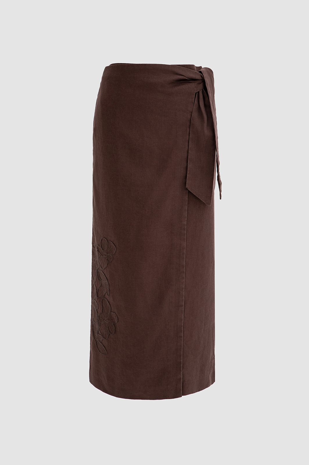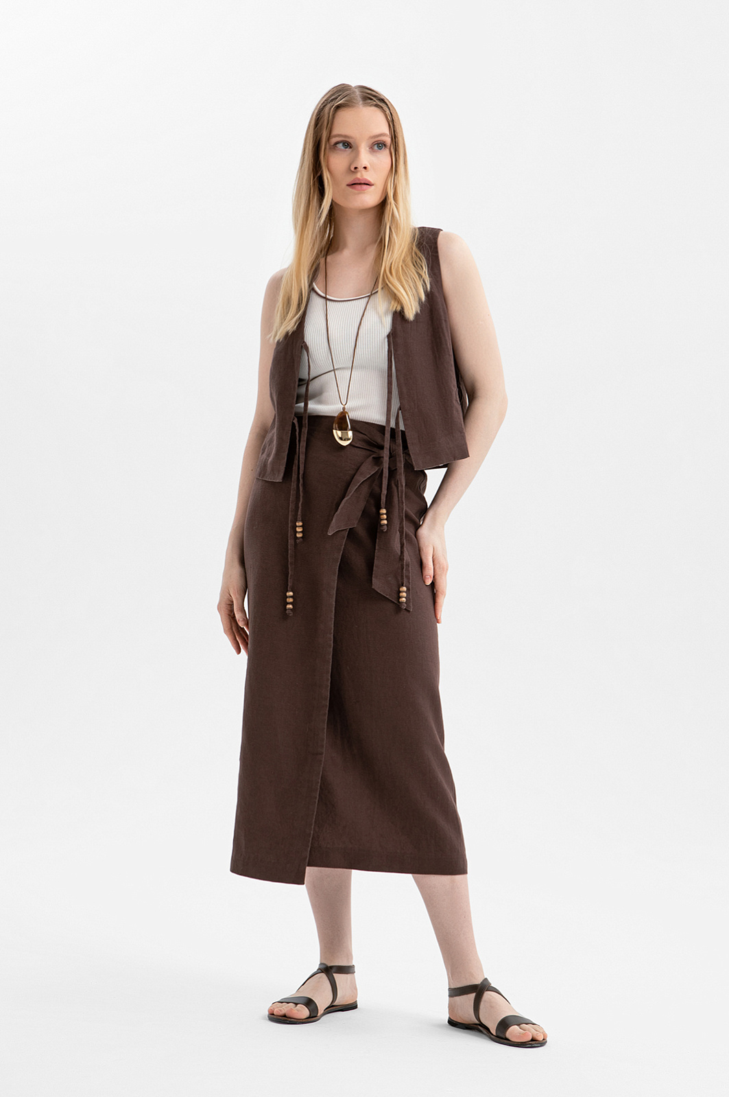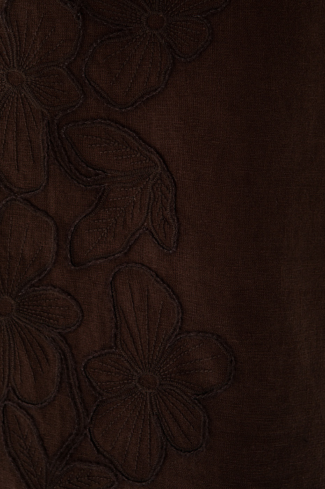 Коричневый льняной костюм KANZLER с цветочной вышивкой воплощает сдержанный этно-шик, естественность и непринуждённость. Природный оттенок напоминает о выжженной солнцем земле, пряных травах и бесконечных вечерах, которые дают почувствовать ускользающее дыхание лета. Верх комплекта — лаконичный жилет на завязках с крупными бусинами. Низ представлен юбкой-миди на запах, которая плавно очерчивает силуэт и при движении подчёркивает грациозность и лёгкость походки. Ткань выполнена из чистого льна, который задаёт полотну характерную структуру. Натуральные гипоаллергенные волокна хорошо пропускают воздух и отводят влагу, защищая тело от перегревания в жаркие дни.
