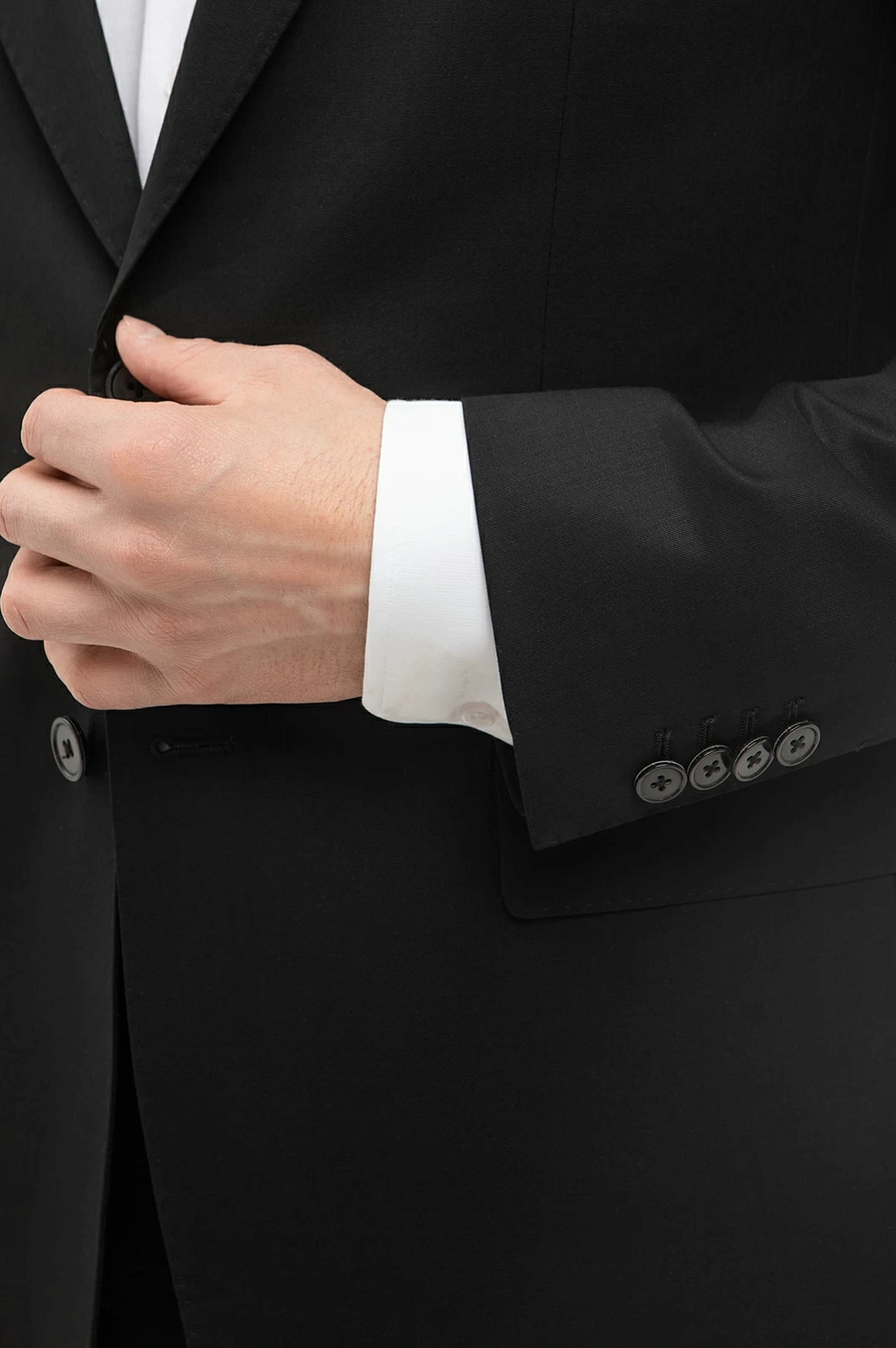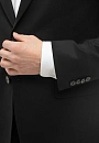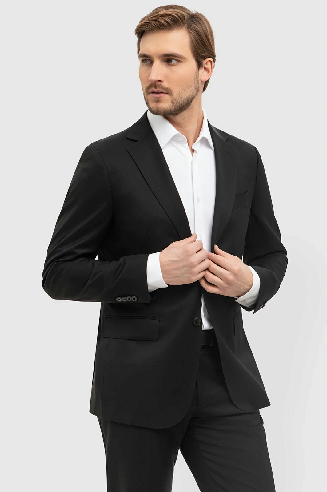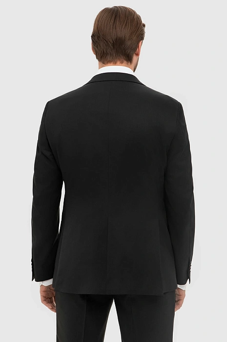 Черный однотонный костюм воплощает элегантность и идеально подходит для деловой встречи и торжественного вечернего мероприятия. Сочетание выверенного кроя и натуральной ткани, усиленной прочным синтетическим волокном, делает пиджак с узкими лацканами и брюки со стрелками максимально комфортными. Высококачественный материал на основе премиальной шерсти мериноса Супер 120S тактильно приятен и долговечен, а подкладка из вискозы добавляет еще больше комфорта в носке. Пиджак великолепно садится по фигуре, сохраняя четкость линий кроя и придавая уверенности в любой ситуации. Приталенный силуэт очерчивает фигуру, а английский воротник и гладкая фактура ткани с матовым финишем придают костюму аристократическую изысканность. Прямые брюки со стрелками завершат образ, подчеркивая вашу безупречность в каждом движении. Пиджак застегивается на пуговицы. Этот костюм станет вашим верным спутником, подчеркивая безупречный вкус и уверенность в себе, независимо от повода.