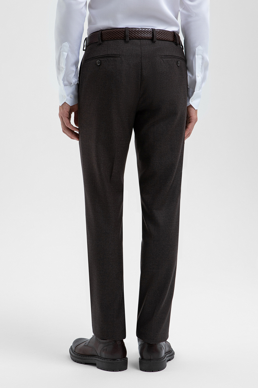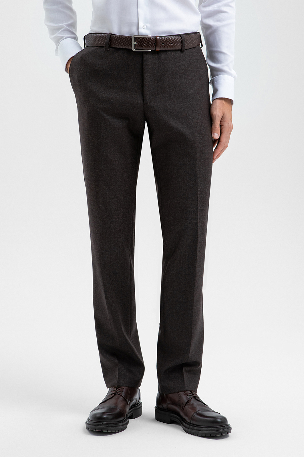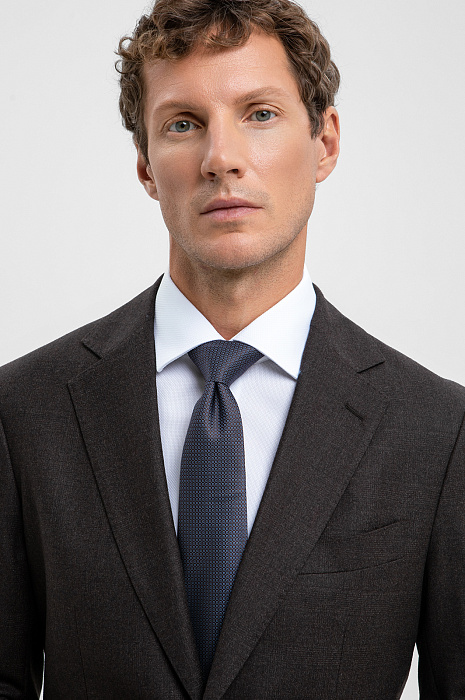 Костюм-двойка KANZLER из дорогой костюмной шерсти коричневого оттенка в микроклетку — образец утончённой роскоши и современной элегантности. Каждая деталь продумана до совершенства. Однобортный пиджак прилегающего силуэта с аккуратными накладными карманами подчёркивает линии фигуры, создавая уверенный и мужественный образ. Брюки зауженного кроя со слегка обозначенными стрелками визуально вытягивают фигуру, поддерживая гармонию пропорций. Благородная натуральная ткань из 100% шерсти мериноса обладает повышенной устойчивостью к загрязнениям и сминанию. Тончайшие волокна Супер 100S поддерживают естественное тепло тела и сохраняют аккуратную форму костюма.