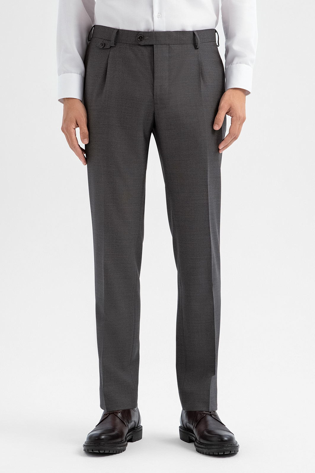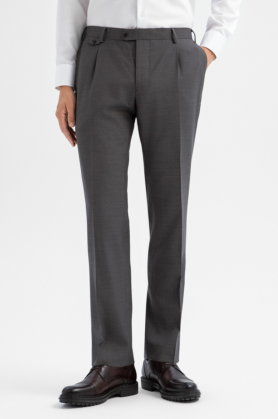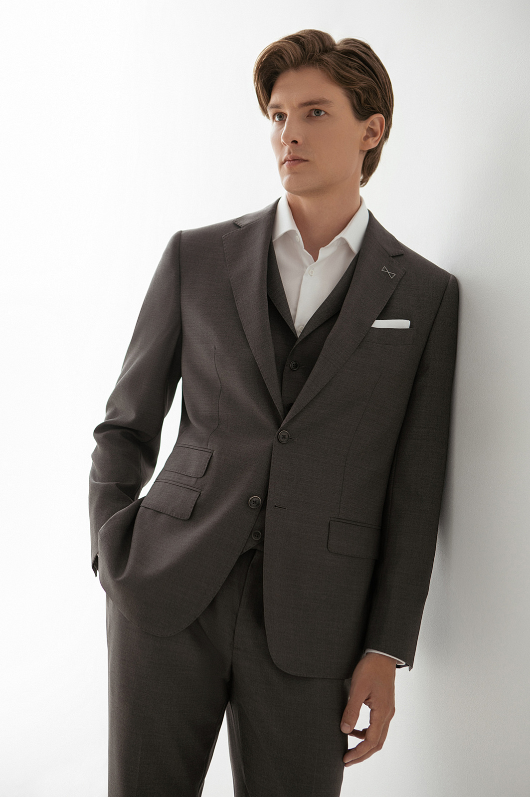 Серый костюм-тройка KANZLER из шерсти мериноса и шёлка воплощает вневременную классику в современном исполнении. Он создан для ценителей безупречного стиля и премиальных материалов. Костюм составлен из пиджака универсального силуэта с фирменной бабочкой на лацкане и карманами с традиционными клапанами, облегающего жилета со спинкой из гладкой ткани и слегка зауженных брюк со стрелками. Элегантное трио привлекает внимание деталями — дополнительный «карман для билетов» на пиджаке и поясной декоративный клапан с пуговицей на брюках отсылают к ретро-эстетике. Костюм создан из тончайшей шерсти Супер 120S с шёлком. Ценный натуральный материал с лёгким благородным лоском хорошо пропускает воздух и бережёт естественное тепло тела. Водоотталкивающая обработка защищает ткань от капризов погоды.