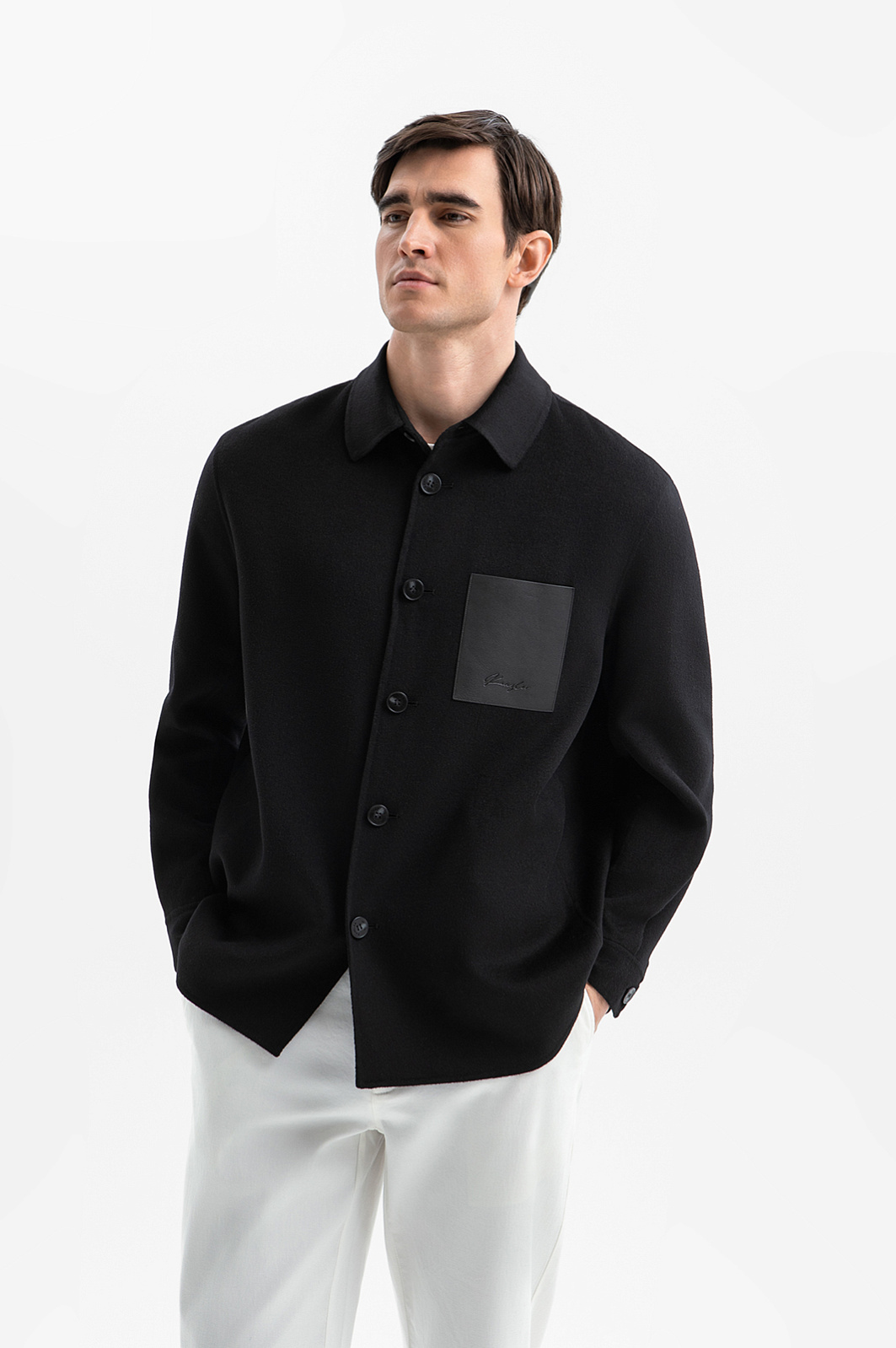 Чёрная куртка-рубашка KANZLER легко становится акцентом образа, не нуждающимся в сложной стилизации. Эффектный минималистичный дизайн выстроен на монохроме и рубашечном крое. Нагрудный карман из гладкой кожи, выделяясь на фоне матового полотна, служит стильным акцентом. Смесовая ткань на основе шерсти — практичный материал, который сохраняет безупречный вид сезон за сезоном. Натуральные гипоаллергенные волокна шерсти, укрепленные нитями нейлона и вискозы, приобретают дополнительные свойства — прочность, износоустойчивость и пластичность.