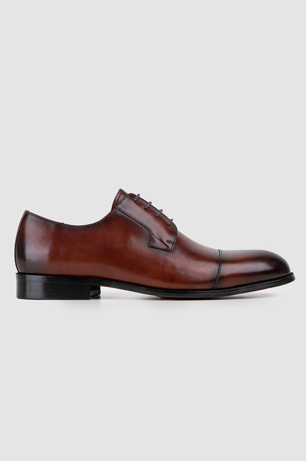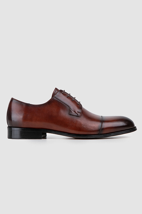 Дерби KANZLER из натуральной кожи коньячного оттенка — воплощение выверенной элегантности без вычурности. Такая обувь идеально дополняет неформальные костюмы и повседневные городские образы. Чёрная патина вдоль швов и на носке и заднике добавляет обуви характер — словно пара уже стала частью личной истории. Контраст матовой поверхности основной части и полированного отрезного мыска придаёт модели шик и отсылает к классическим канонам. Подкладка и стелька, выполненные из гладкой натуральной кожи, обеспечивают комфорт для ног в течение дня. А резиновая подошва — устойчивость при ходьбе.