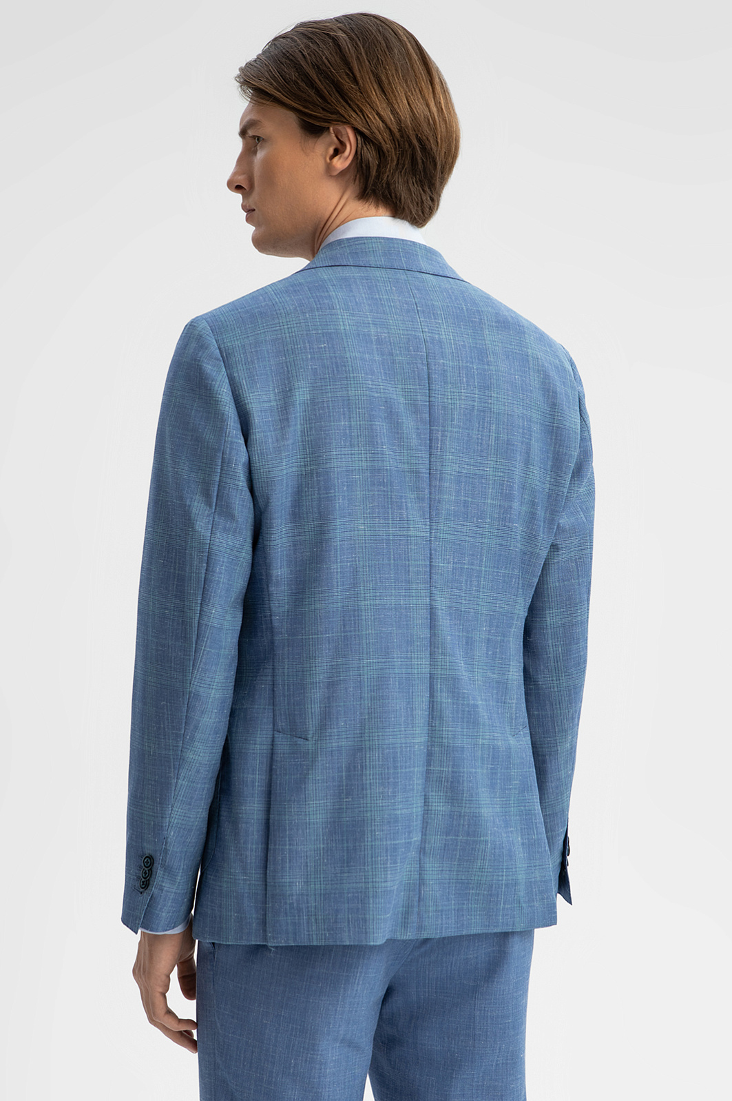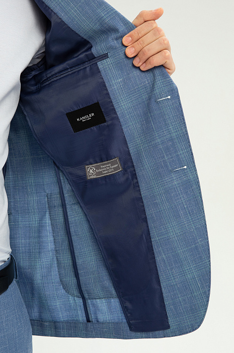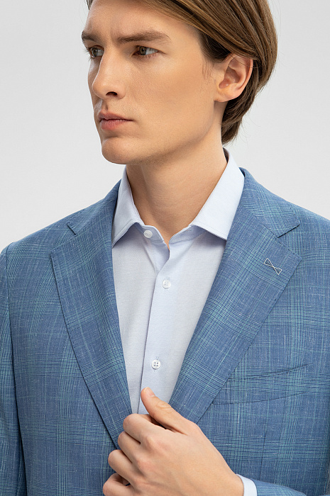 Изящный однобортный пиджак KANZLER василькового оттенка в тонкую широкую клетку из шерсти, льна и шелка — способ привнести легкость и непринужденность в деловые будни и элегантность — в неофициальные мероприятия. Облегченная модель слегка зауженного силуэта без подкладки идеально подходит для теплого сезона. Традиционные детали сочетаются с легкими накладными карманами и небольшой декоративной вышивкой на лацкане. Дорогая натуральная ткань объединила все лучшее сразу. В составе — тонкая овечья шерсть Супер 120S, лен и шелк. Упругие волокна шерсти держат форму и берегут естественное тепло тела, прочный износоустойчивый лен обеспечивает циркуляцию воздуха и отводит влагу, легкий шелк придает ткани благородный лоск. Параметры модели: рост 191, 97-77-99 Размер на модели: 50