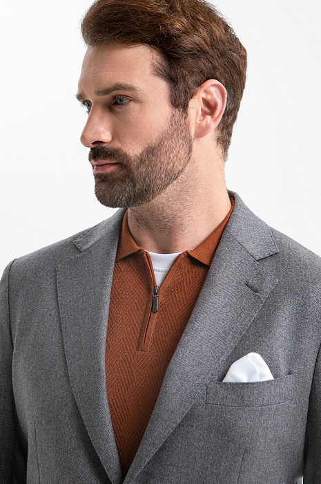 Стильный серый пиджак KANZLER из дорогой шерсти Супер 120S (100%) воплощает сдержанную роскошь и современный комфорт. Он легко адаптируется к разным сценариям жизни: органично смотрится в офисе и в более расслабленной атмосфере — на неформальных встречах и мероприятиях. Слегка приталенный крой хорошо очерчивает фигуру, формируя динамичный образ. Облегчённая конструкция с частичной подкладкой дарит телу свободу, а естественная линия плеча подчёркивает гармоничность силуэта. Две шлицы сзади обеспечивают свободу движения, а накладные карманы добавляют нотку неформальности. Ткань мягко облегает тело. Тончайшая шерсть Супер 120S поддерживает комфортную температуру, умеет «дышать», превращая повседневное ношение в приятный ритуал. Благодаря водоотталкивающей обработке материал всегда сохраняет безупречный вид. Параметры модели: рост 189, 102-80-99 Размер на модели: 50
