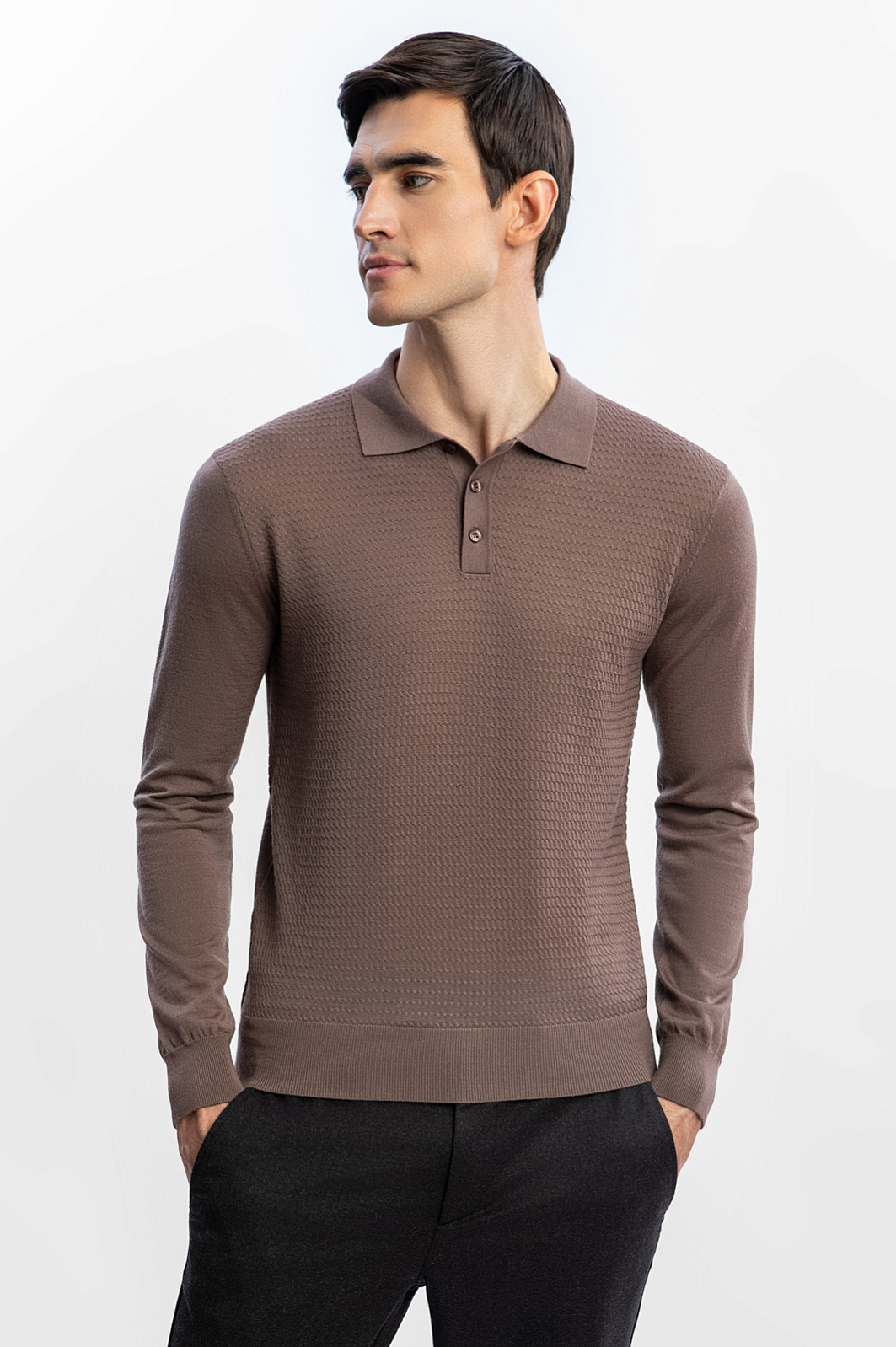 Поло KANZLER из тонкого шерстяного трикотажа оттенка молочного шоколада хорошо сочетается с джинсами в повседневных аутфитах и с пиджаком — в современных деловых образах. Трикотаж мягко облегает тело. Передняя часть украшена приятным слегка фактурным узором. Широкая трикотажная резинка обеспечивает хорошую посадку и надежно держит края. Ткань сделана из 100-процентной шерсти. Тонкие натуральные волокна быстро восстанавливают форму, не мнутся, придают материалу благородный вид и сохраняют тепло тела, защищая от холода и перегревания. Параметры модели: рост 192, 101-76-97 Размер на модели: M
