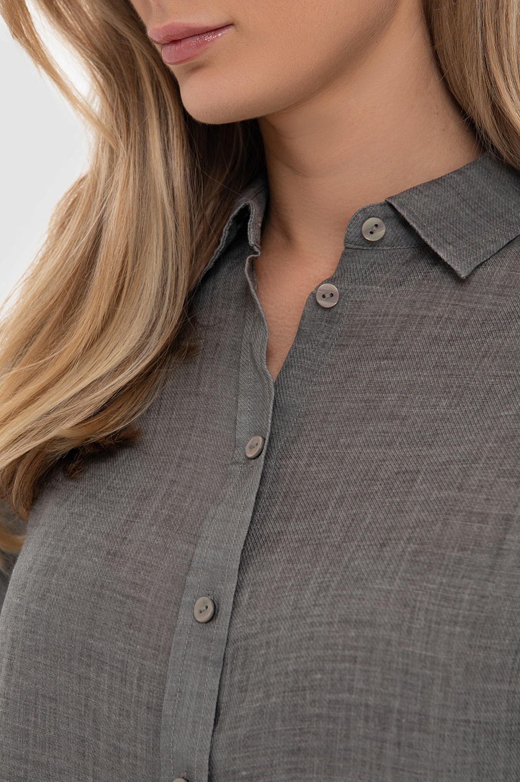 Свободная женская рубашка серо-зеленого цвета из 100% рами — воплощение современного минимализма и комфорта. Рами — экологически чистый материал из натуральных волокон Бемерии, обладающий высокой прочностью и великолепными дышащими и антибактериальными свойствами. Ткань легко впитывает влагу и дарит ощущение прохлады. Свободный крой подчеркивает расслабленность и легкость образа, не теряя при этом элегантности. Серо-зеленый оттенок с легким серебристым сиянием добавляет изысканности и делает рубашку универсальной деталью гардероба. Рекомендуем сочетать модель со свободными шортами для создания образа в стиле сафари. Параметры модели: рост 180, 87-61-91 Размер на модели: S