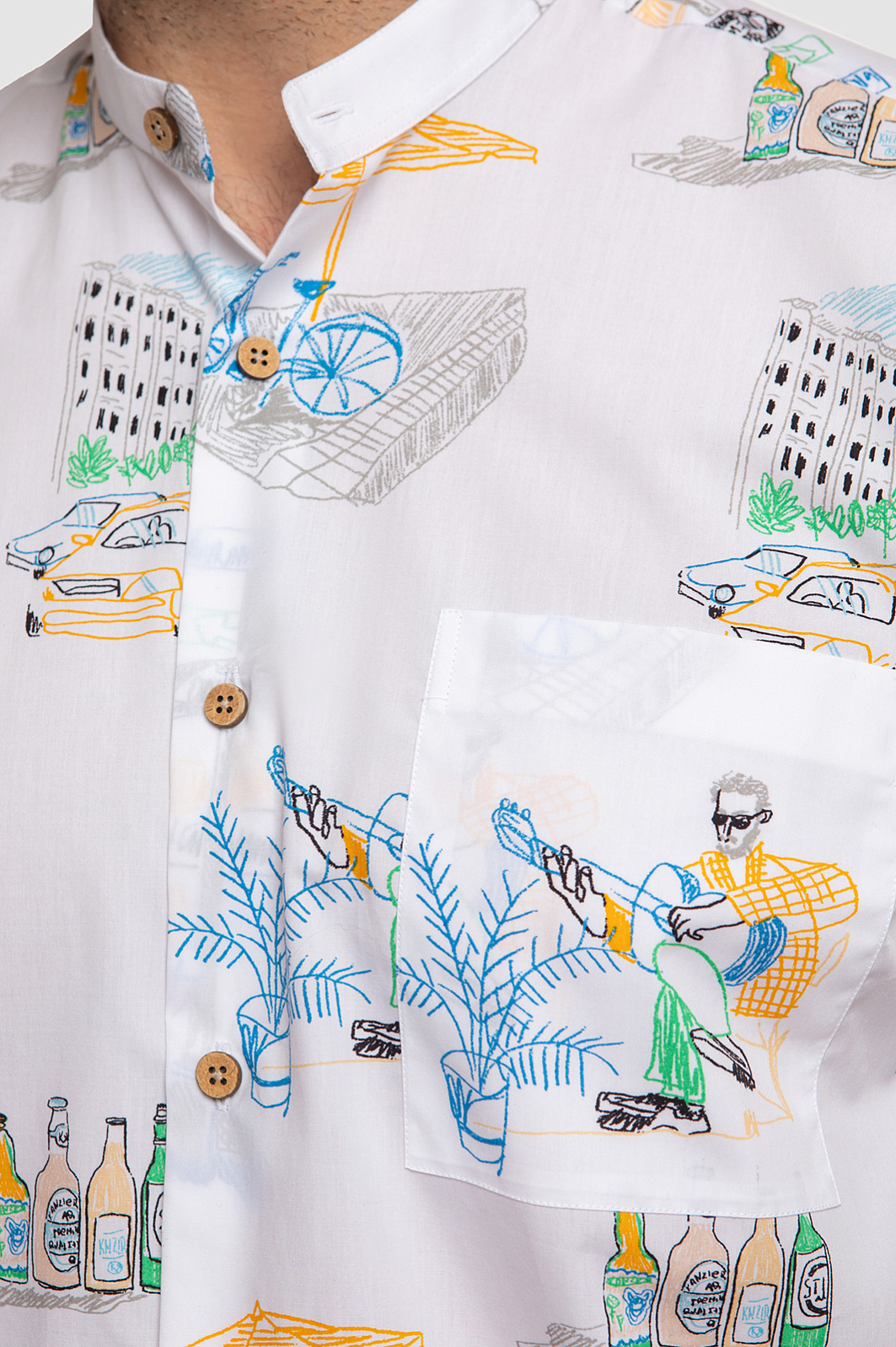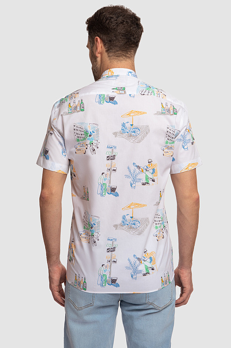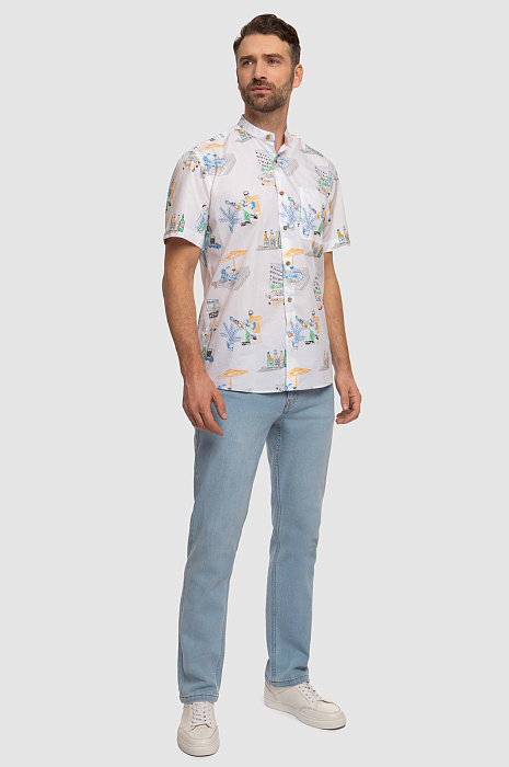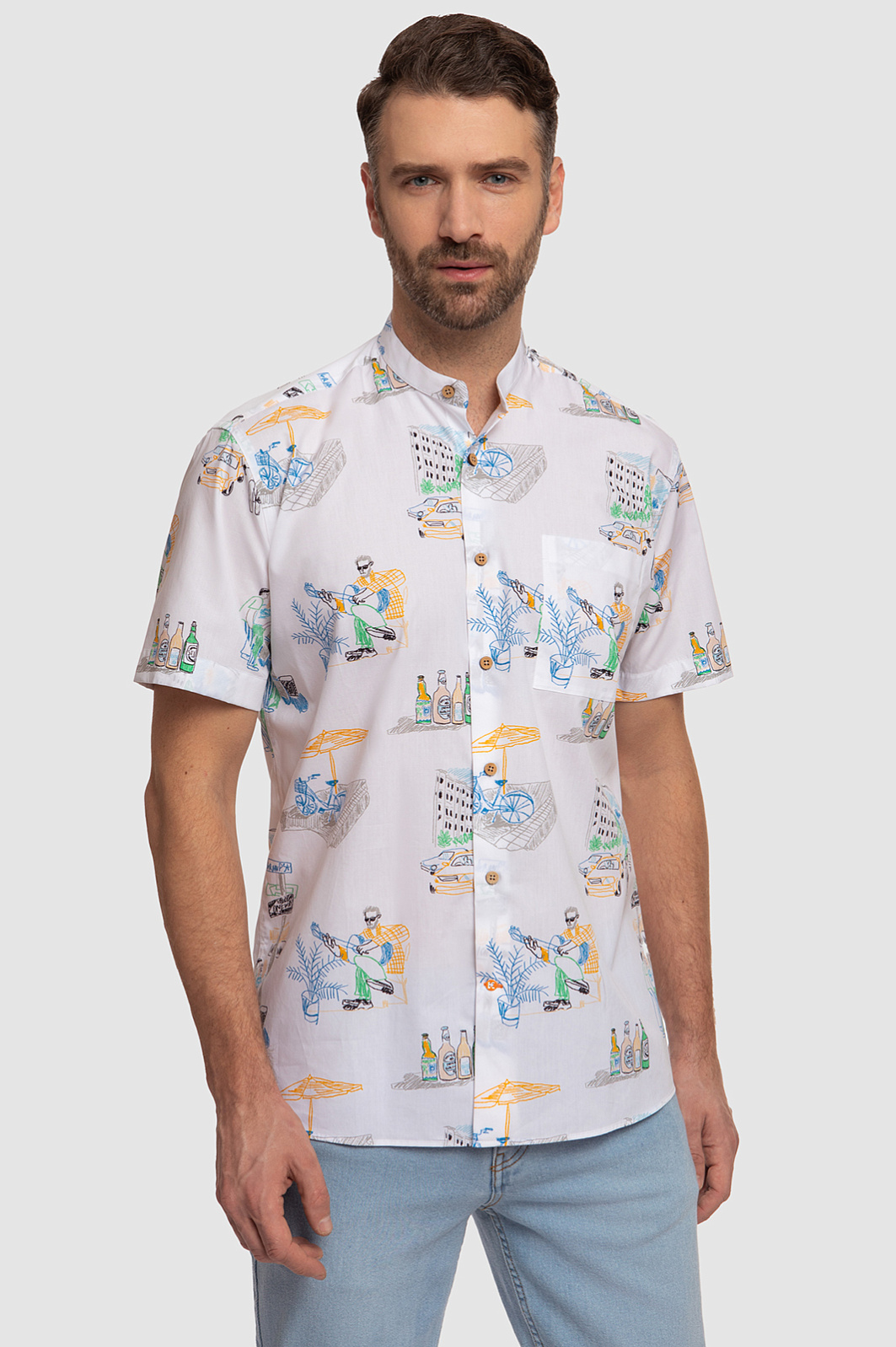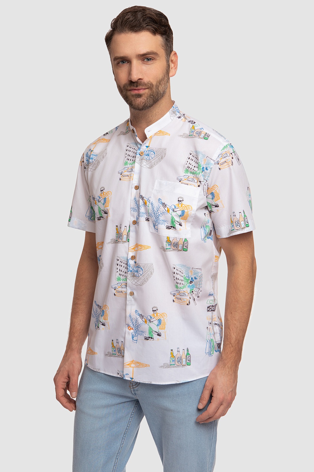 Легкую белую рубашку KANZLER с коротким рукавом, воротником-стойкой и нагрудным карманом дизайнеры украсили принтом. Ироничные рисунки напоминают об отпускной безмятежности и вдохновляют повторить прекрасные моменты. Модель из натурального материала отличается свободной посадкой и сочетается с голубыми джинсами и бермудами. Воротник-стойка легко ложится на шею, не ограничивая движений. Спереди — застежка на пуговицы. Низ — слегка скругленный. Воздухопроницаемый чистый хлопок защищает от жары, сохраняя приятную прохладу даже в самый знойный день. Параметры модели: рост 189, 102-80-99 Размер на модели: 40