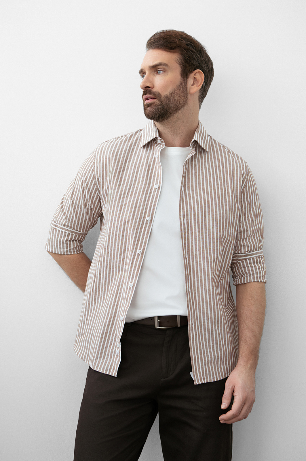 Сорочка KANZLER коричневого оттенка из хлопка и льна — пример современной мужской классики, в котором комфорт и эстетика существуют на равных. Коричневый оттенок выглядит тепло и стильно. Вертикальная белая полоса визуально вытягивает силуэт и добавляет образу графичности. Прямой крой задаёт спокойный уверенный силуэт, не перегружая образ. Роскошная ткань сделана из гипоаллергенных материалов: 70% хлопка и 30% льна. Хлопок отвечает за комфорт и свежесть, а лён придаёт материалу лёгкую фактурность. Натуральная ткань хорошо держит форму и со временем лучше адаптируется к фигуре, приобретая расслабленный и естественный вид.